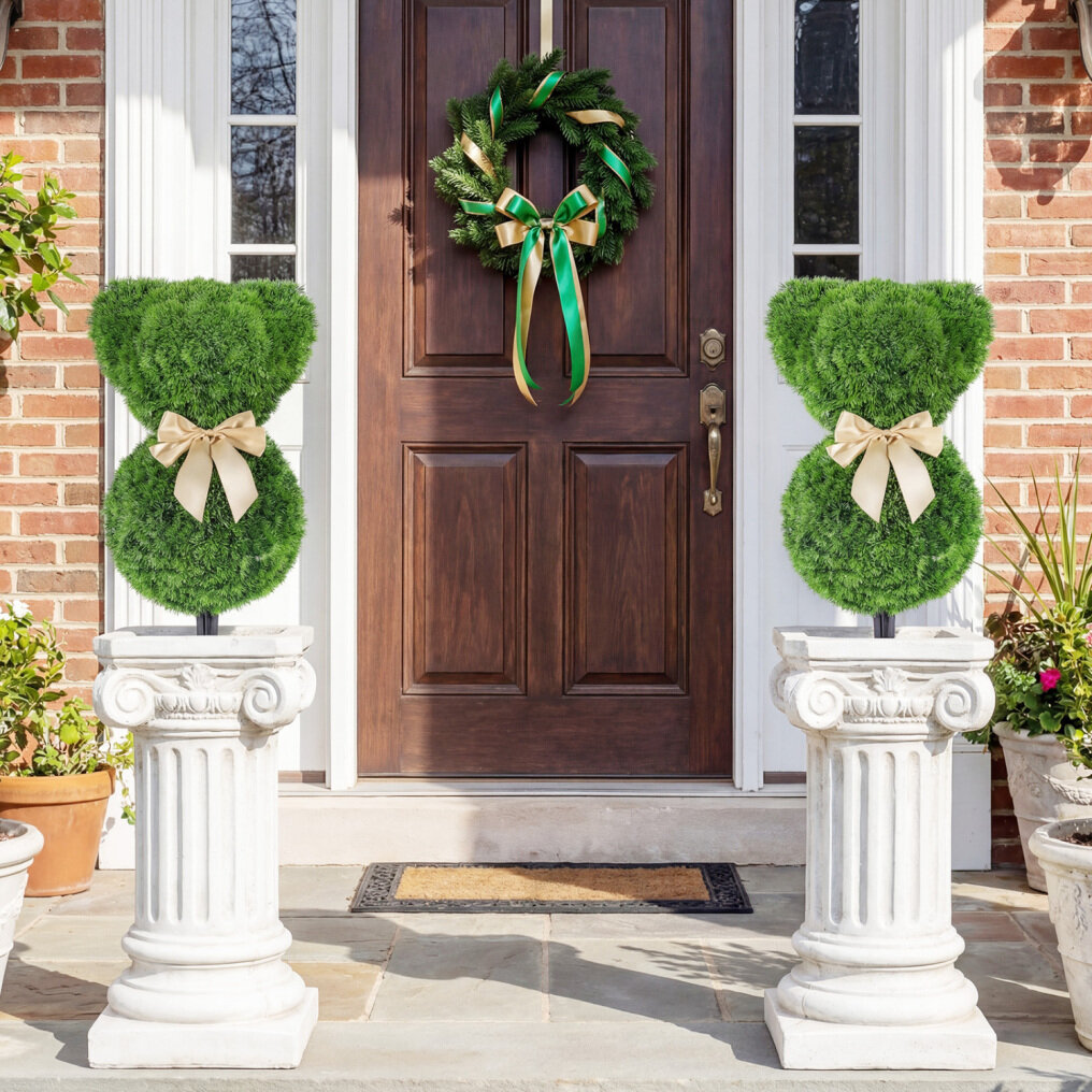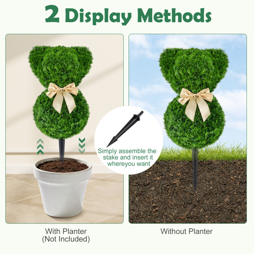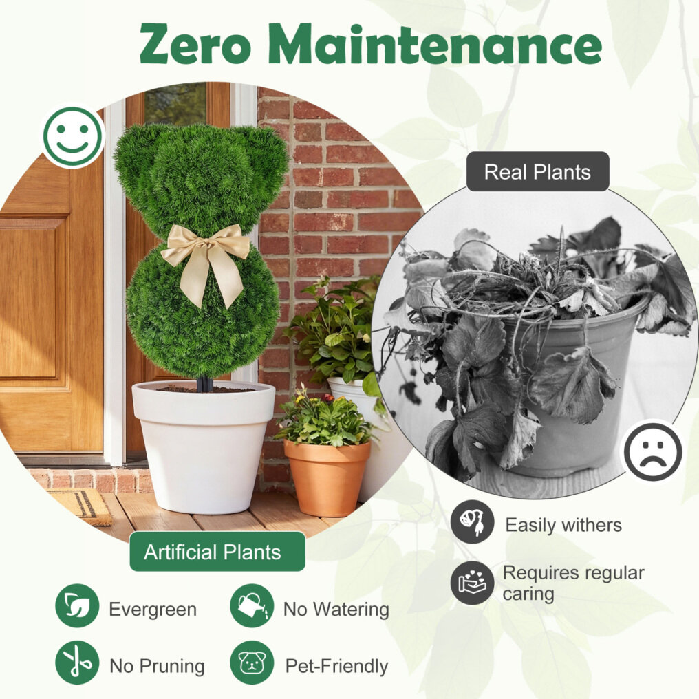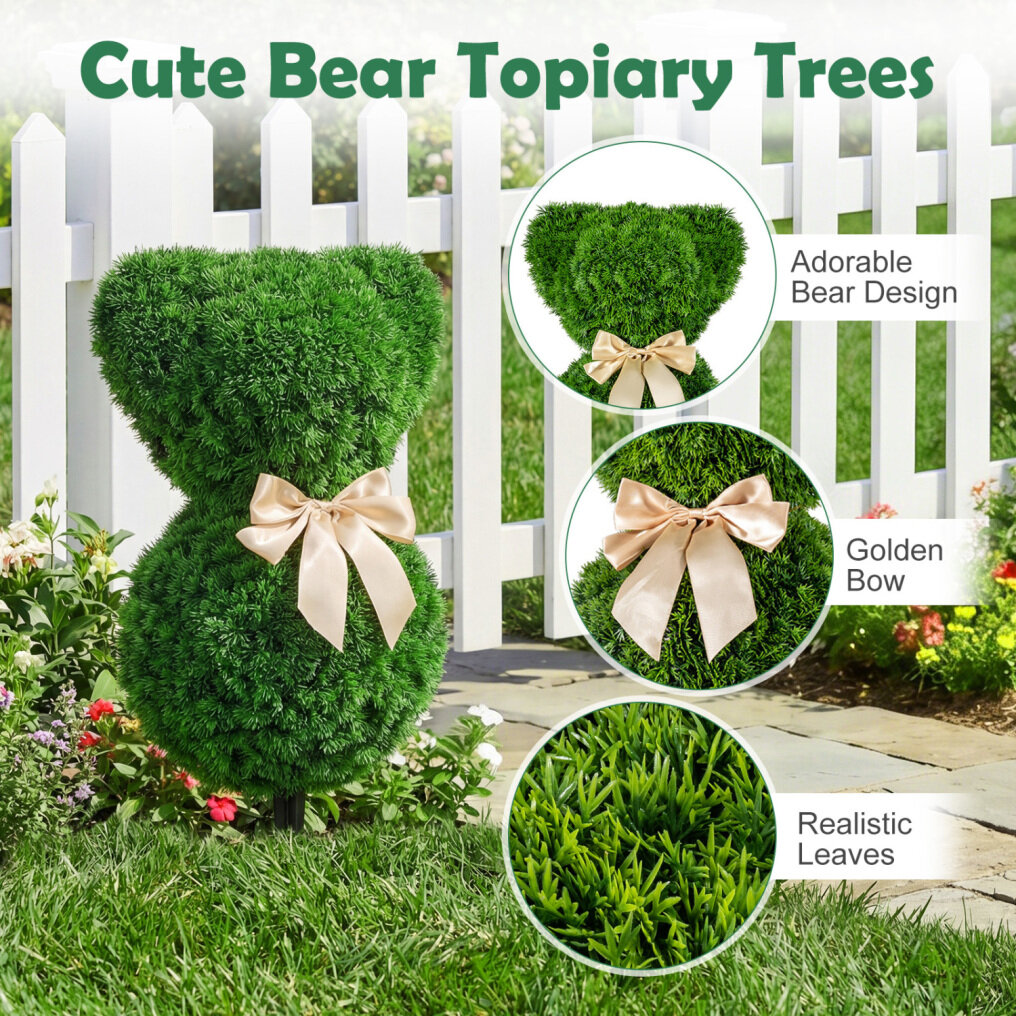 ● Whimsical Little Bears: These 2 packs topiary trees feature a chubby teddy bear design, a graceful golden bow, and lush boxwood-style foliage with natural color variation, creating a sweeter, more playful look than ordinary greenery for spring displays and themed parties.