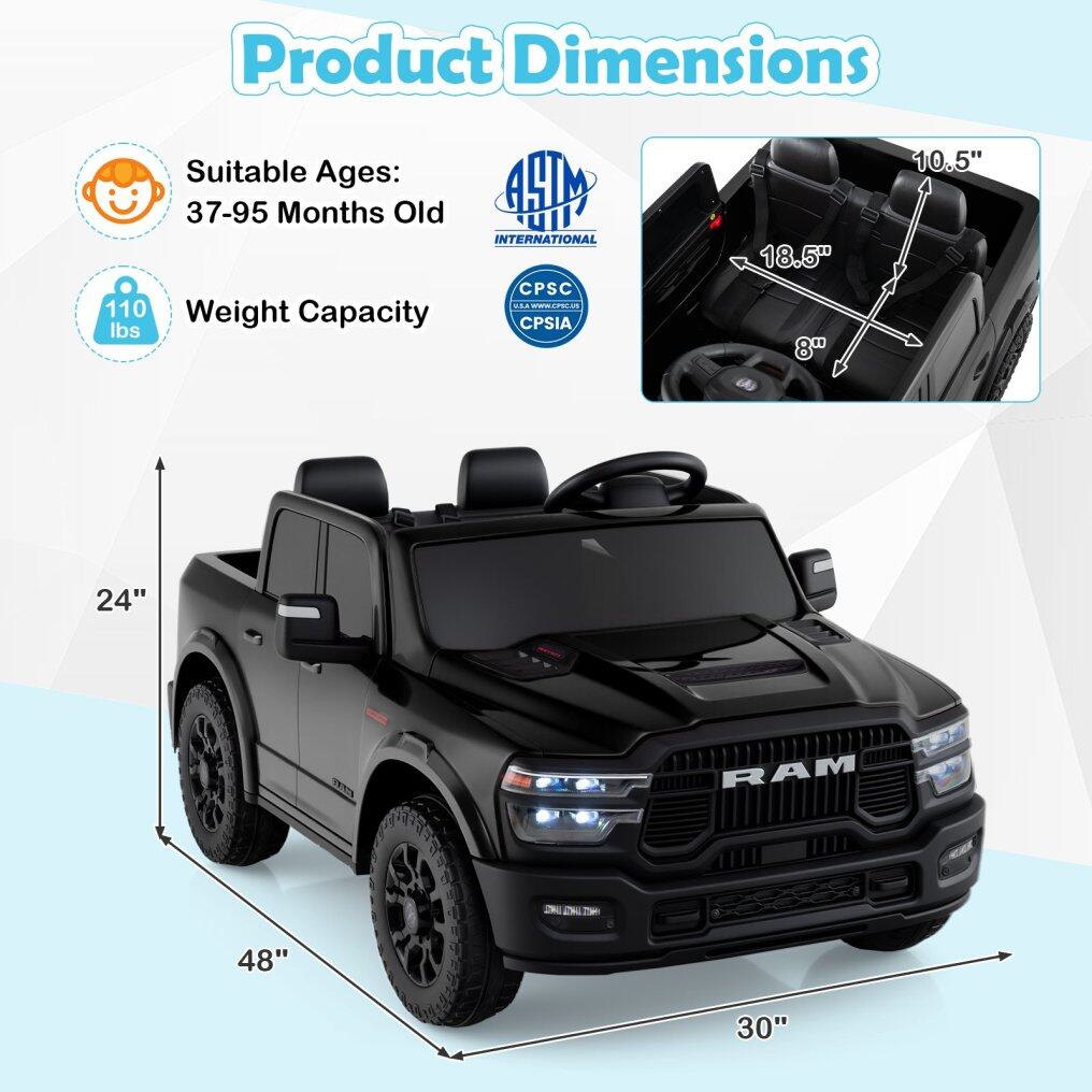 ● Licensed Ride on Truck: This licensed 2025 Ram 2500 REBEL ride on pickup truck boasts 2 × 100W motors, providing a 1.4-3.2 mph speed range to satisfy different needs. Powered by a 24V battery, the ride on toy keeps the adventure going on. Recharging is a breeze with the integrated charging port and included charger.