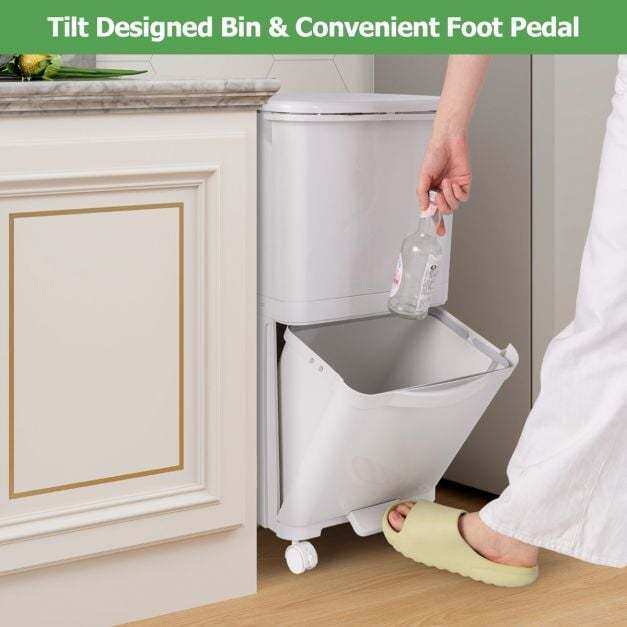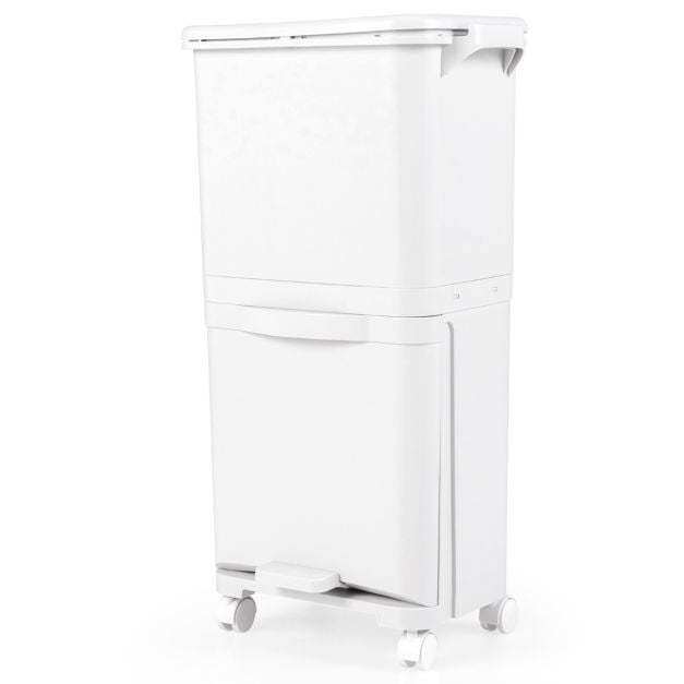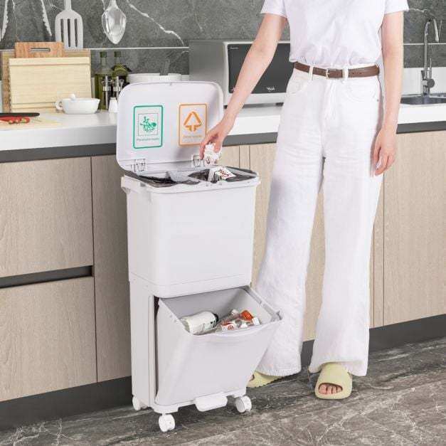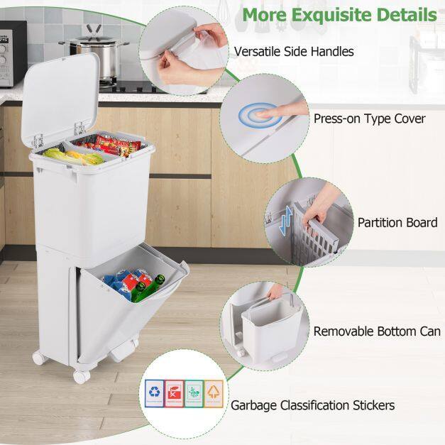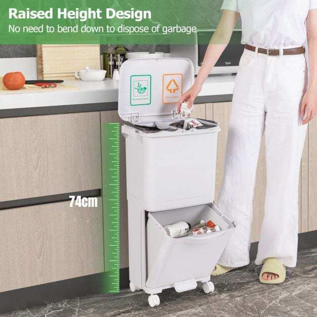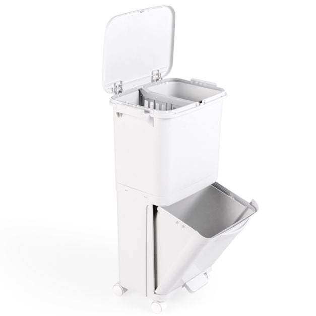 Multifunctional trash can with 3 compartments for waste separation. Facilitates disposal without bending down. With 4 wheels (2 of them with brakes) for easy movement. Made of high-quality PP material for durability. Large capacity of 40L, ideal for small spaces. With hinged lid, waste classification sticker and removable container for easy cleaning. Practical addition to any home.