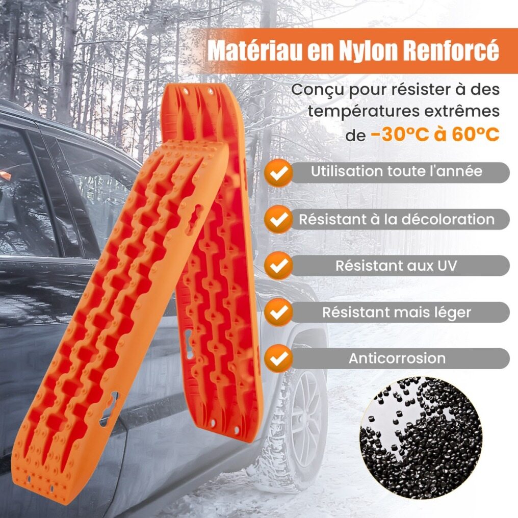 Lightweight and Durable Material: This off-road traction board is made of reinforced nylon material and is designed to withstand extreme temperatures from -30°C to 60°C, making it suitable for year-round use. This material is also fade-resistant, UV-resistant and corrosion-resistant.