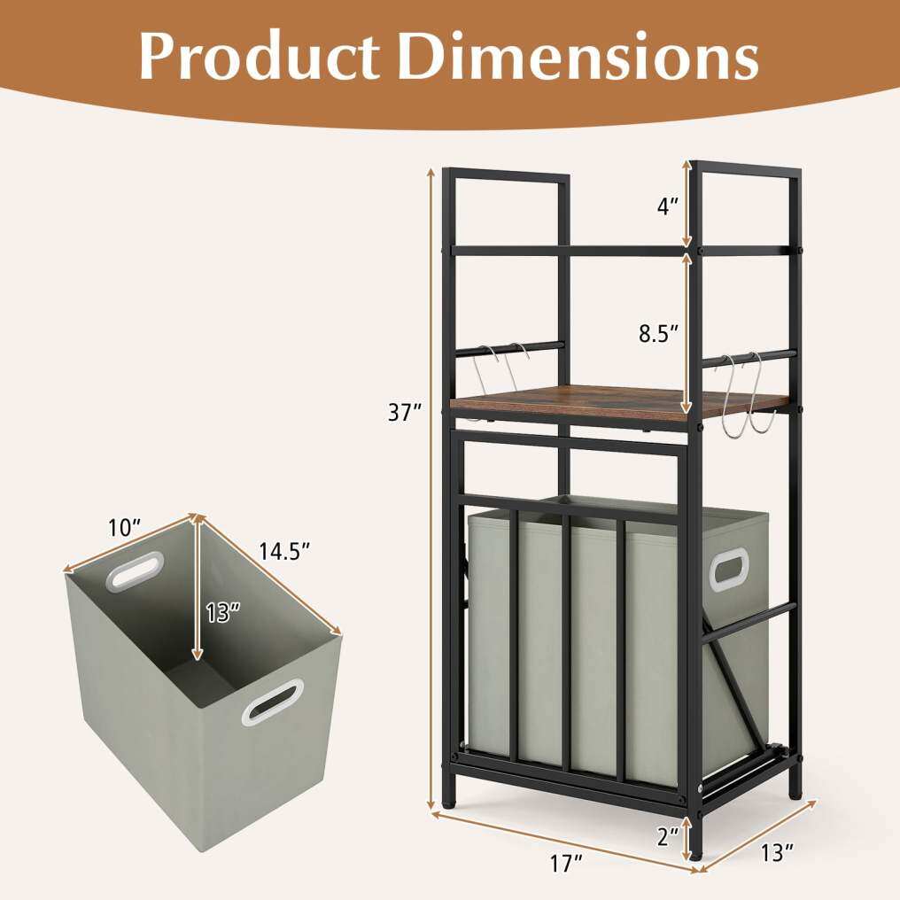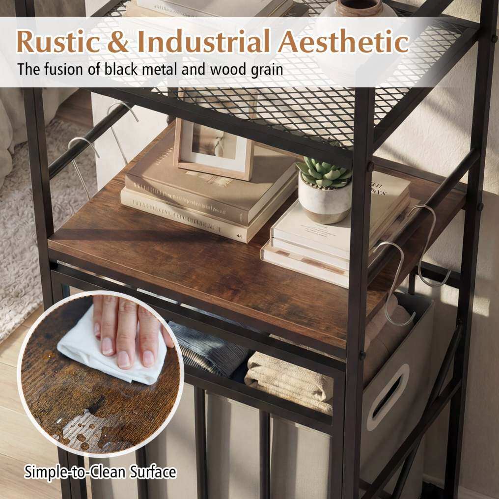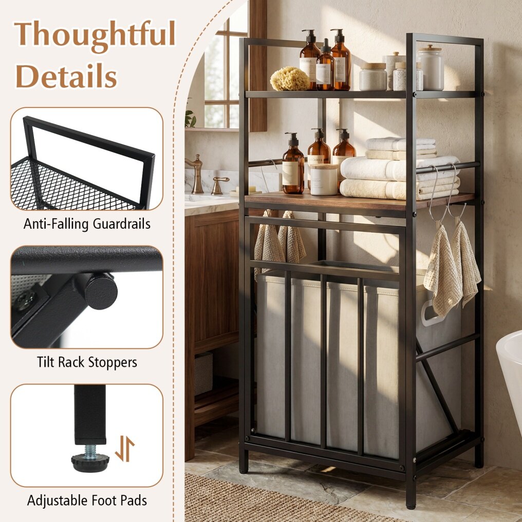 ● Sturdy Metal Construction: Built with a robust metal frame and adjustable foot pads, this laundry organizer ensures stability and reliable support. The anti-falling guardrails of each open shelf add an extra layer of safety.