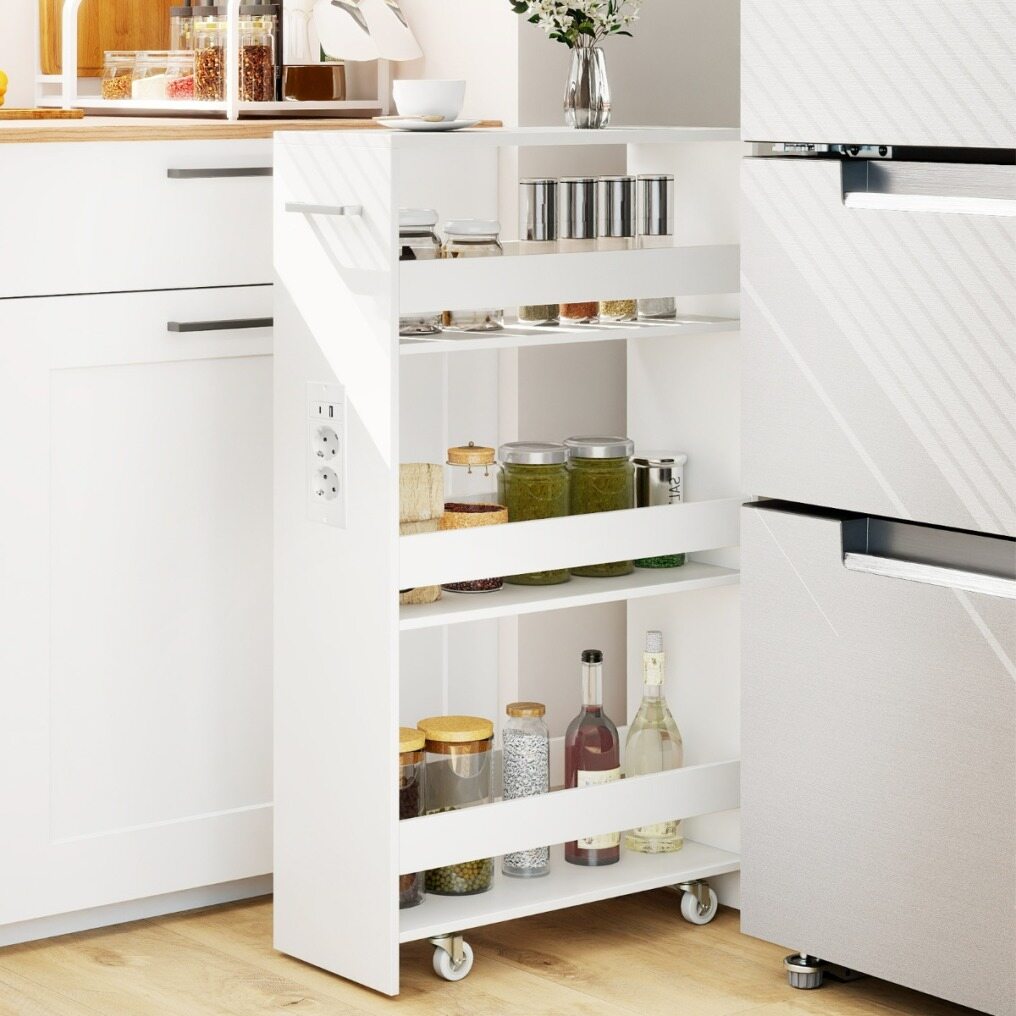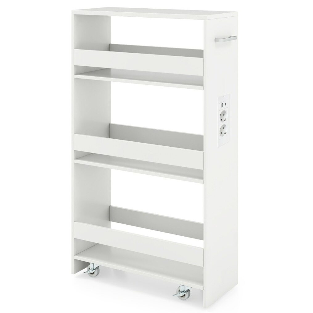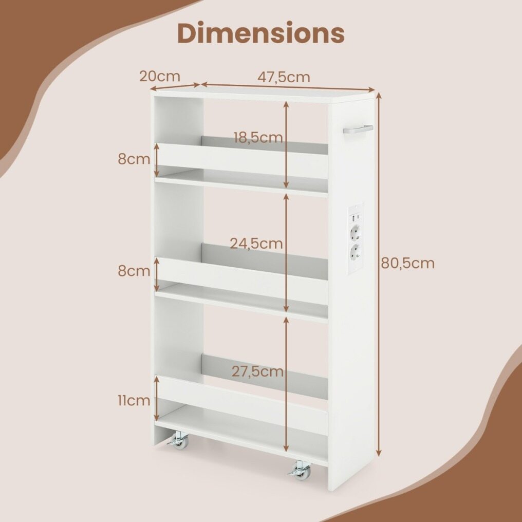 Revolutionize your home organization with this ultra-slim rolling storage cart, designed to fit into even the tightest spaces—next to refrigerators, between washing machines, or in tight corners. Featuring a clever 4-tier design, it neatly holds everything from kitchen jars to laundry essentials, while its sturdy guardrails protect your belongings and keep them within easy reach. Stay powered without the chaos thanks to the side charging station with AC, USB, and Type-C outlets that keeps your devices and cables organized. Move the cart with ease using the handle and four smooth-rolling casters (two of which lock for added stability). Made with easy-to-clean panels, this compact organizer is both stylish and durable. Perfect for the kitchen, living room, or laundry room, it's the design solution your space has been waiting for!
