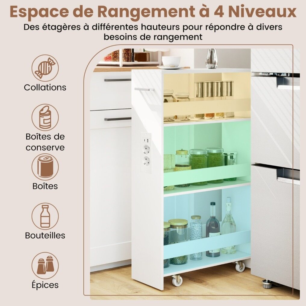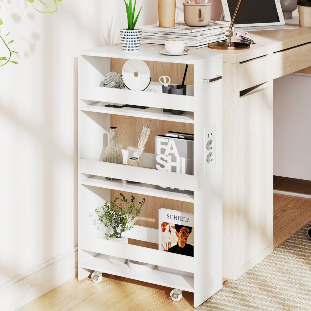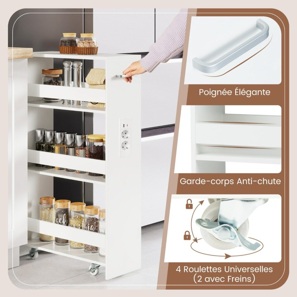 Revolutionize your home organization with this ultra-slim rolling storage cart, designed to fit into even the tightest spaces—next to refrigerators, between washing machines, or in tight corners. Featuring a clever 4-tier design, it neatly holds everything from kitchen jars to laundry essentials, while its sturdy guardrails protect your belongings and keep them within easy reach. Stay powered without the chaos thanks to the side charging station with AC, USB, and Type-C outlets that keeps your devices and cables organized. Move the cart with ease using the handle and four smooth-rolling casters (two of which lock for added stability). Made with easy-to-clean panels, this compact organizer is both stylish and durable. Perfect for the kitchen, living room, or laundry room, it's the design solution your space has been waiting for!