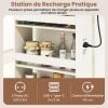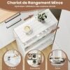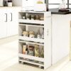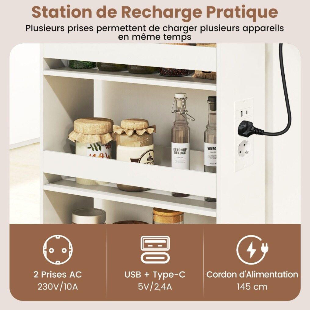 【Integrated Charging Station】This rolling kitchen cart features a side-mounted, integrated charging station with two AC outlets, a USB port, and a Type-C port to power your devices without cluttering the top surface. The integrated design keeps cables organized and the main storage area free for other essentials.