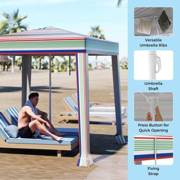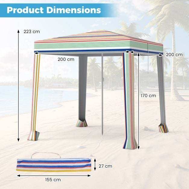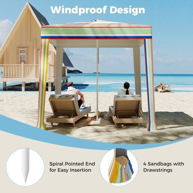 Wind-proof Structure: The beach cabana is designed with a spiral pole end that can be easily anchored into the sand, offering stability in windy conditions. Moreover, the sun shelter includes 4 sand pockets where you can place heavy objects to prevent it from being blown away by wind.