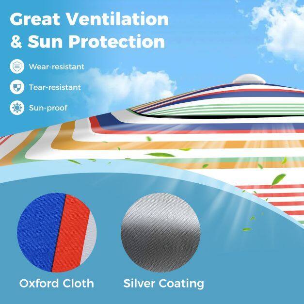 The beach sun shelter is equipped with a vented canopy made from premium silver-coated oxford cloth. This high-quality material provides great ventilation & sun protection, ensuring you can enjoy endless hours under the sun. The sturdy metal frame of the sun shelter boasts 4 thick umbrella ribs that significantly enhance its stability. To further bolster its wind-proof performance, the leg fabric of the beach cabana comes with sandbags that allow you to add weighted objects. This extra feature will keep your shelter firmly in place even in breezy conditions. With a pointed end design, the outdoor canopy tent can be effortlessly anchored to the sand, preventing it from getting carried away by winds. Designed for on-the-go convenience, the portable tent comes with a handy carrying bag. Lightweight and compact, it can be easily transported to and from the beach, park, or any outdoor adventure. If you are looking for such a product, do not hesitate to buy it!