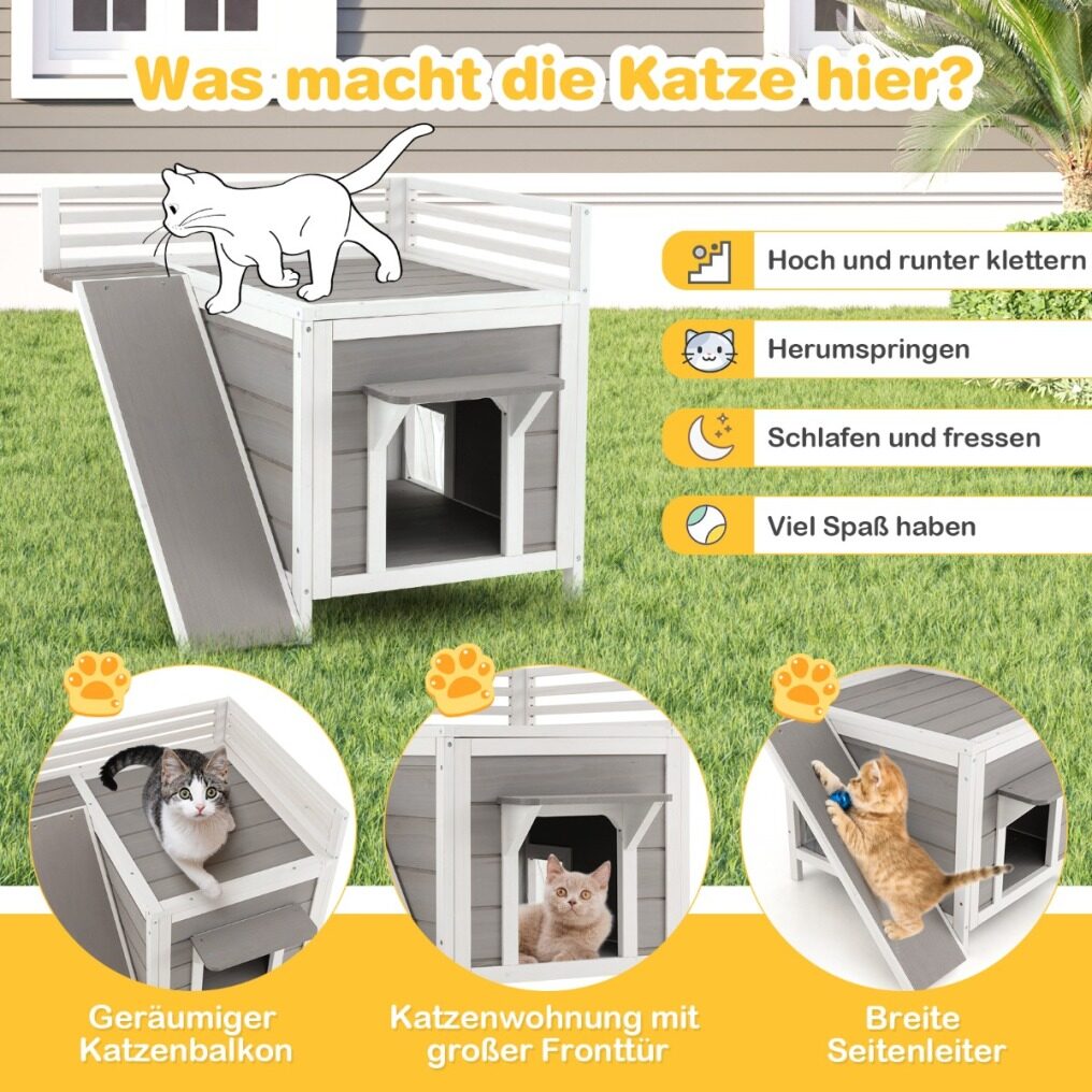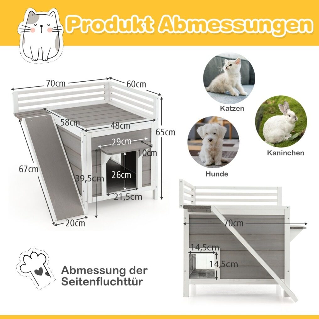 ● All-Weather Construction: The kitten shelter adopts a tilted asphalt roof, which can effectively resist water while providing sun protection, keeping the interior warm and dry. Furthermore, the painted wooden surface is waterproof, ensuring long-term outdoor use.