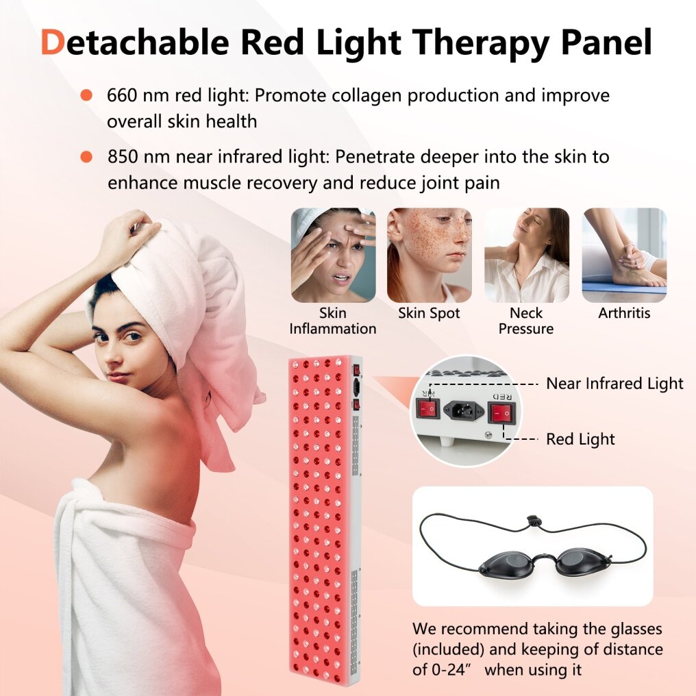 ● Detachable Red Light Therapy Panel: The sauna room is equipped with a red light therapy panel, which provides 660 nm red light that could promote collagen production and improve overall skin health, and 850 nm near infrared light that can penetrate deeper into the skin to enhance muscle recovery and reduce joint pain. (Note: We recommend taking the glasses (included) and keeping a distance of 0-60 cm/0-24" when using it.)