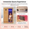 ● Dual Panel Operation and Immersive Sauna Experience: The wooden sauna room is equipped with dual intelligent control panels, bringing convenience for operation both inside and outside the sauna. And the inside panel features APS function with 3 sound effects (low/medium/high) and mute function. Furthermore, the inside panel features a USB input, MP3 play, and FM radio, accompanied by stereo dual speakers that can be connected via Bluetooth. And the wooden handle with groove could securely hold your electronic device.