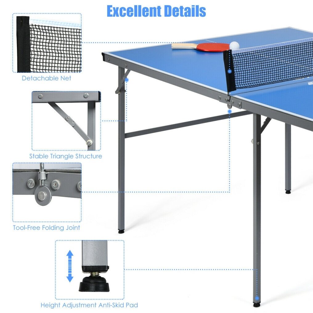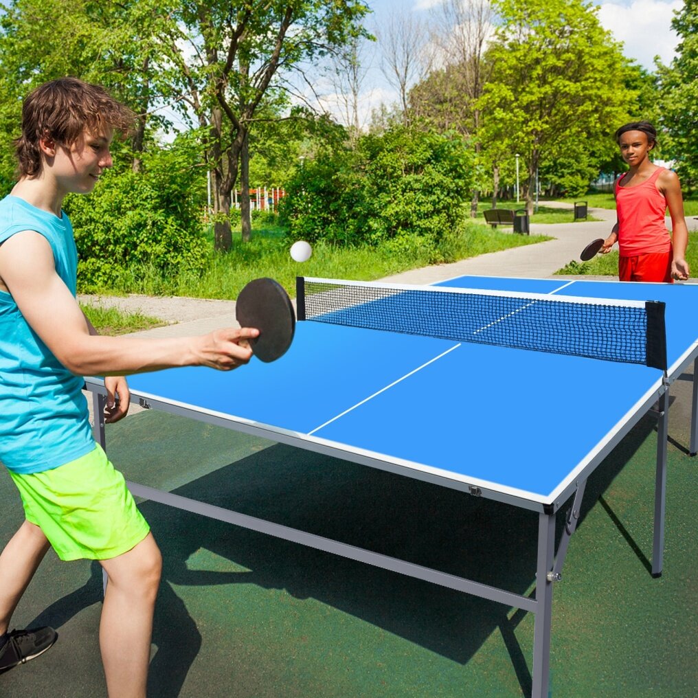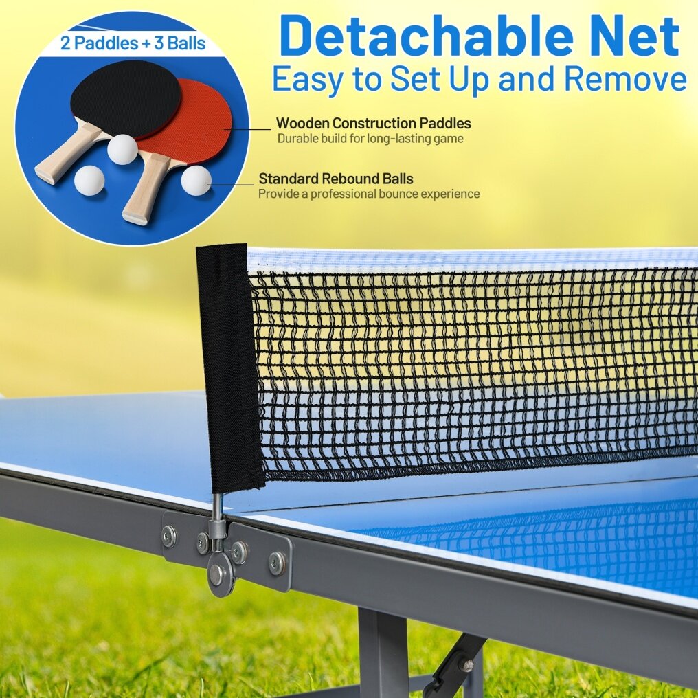 Compared with the traditional one, this table-tennis table makes an innovative breakthrough. Its foldable design makes it more convenient for both storage and carry, and makes the assembly tool-free. Premium table top gives a fine bounce to the ping-pong ball, increasing the game experience. Stable structure allows intense play without overturning. Besides, 1 net, 2 professional ping-pong bats, and 3 ping-pong balls are included.