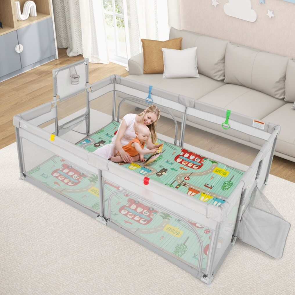 Cozy and Soft Play Mat: Coming with a dual-sided, foldable mat, the large baby playard adds comfort to playtime. The mat has height scales and English words, creating an educational space for your child. While the reinforced edges and non-slip surfaces enhance its durability and safety.