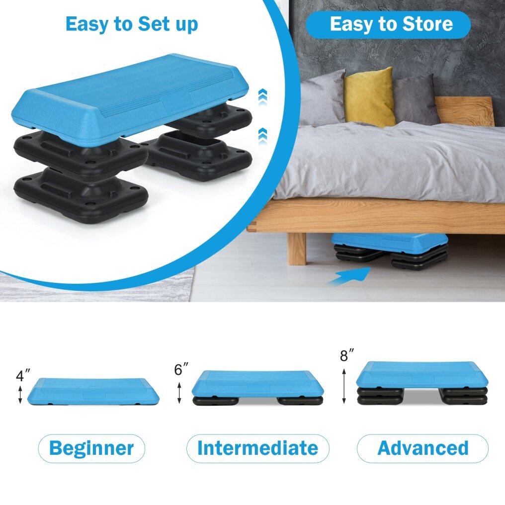It is made of high-quality PE material, with a sleek shape, providing you better experience. Besides, the platform comes with 4 detachable risers, which are designed to diversify your workout forms and adjust workout intensities. Its height ranges from 4" to 8", allowing users of different skill levels (beginner, intermediate or advanced levels) to do exercise at their own pace. And the small stepper can be used for a variety of cardio exercises, including push-ups, squats, lunges, and strength training with small dumbbells. Therefore, it can effectively help you keep in good shape and build up strength. What's more, the fitness platform equipped with textured stepping surface and anti-skid foot pads for a more stable performance. It also features great portability, so you can either use it at home or take it for gym classes.