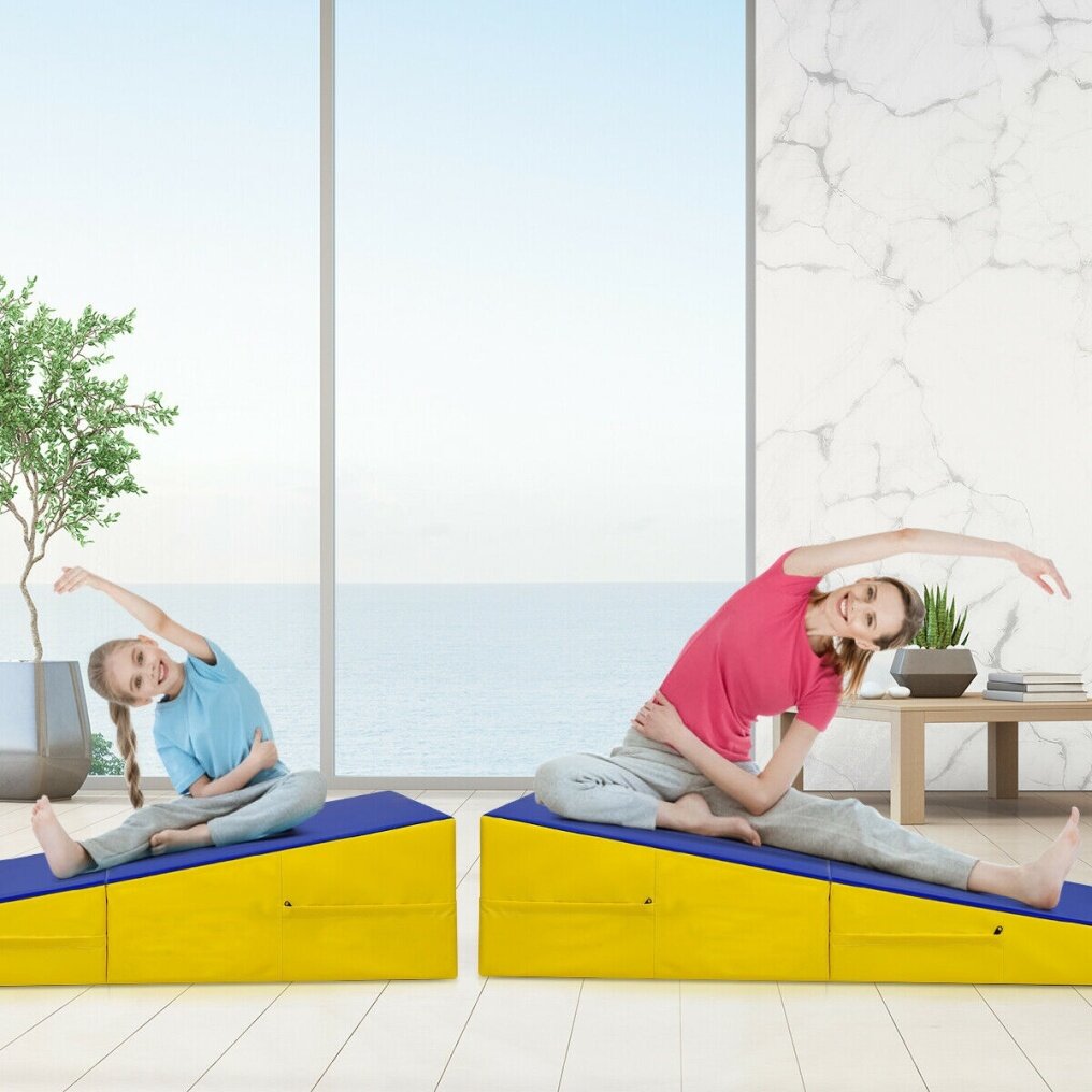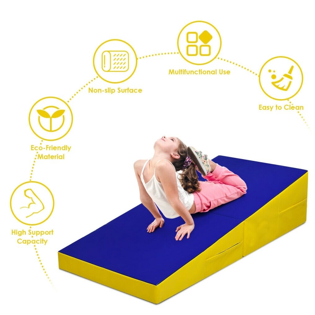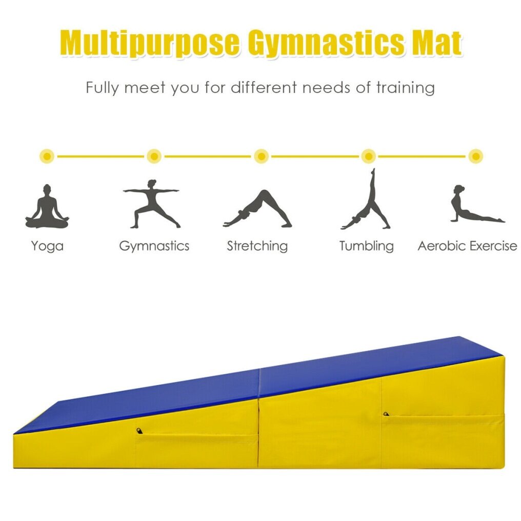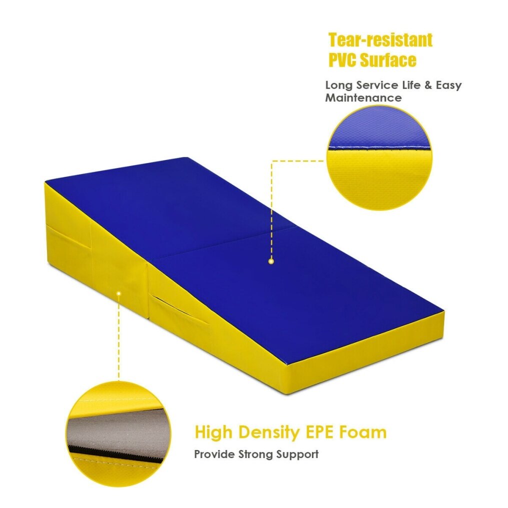 The surface of the gymnastics exercises mat is made of anti-slip PVC, which is wear-resistant and can be used for a long time. It is ergonomically designed, and the slope is suitable for athletes on different training levels to do various sports, such as tumbling, gymnastics, stretching, yoga, aerobics, etc. In addition, with its foldable design and convenient handles, the gym mat is easy to carry and store. Just try and you will love it!