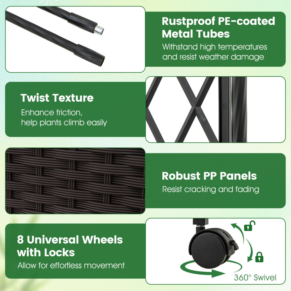 Easy Mobility: The planters come equipped with 8 lockable wheels for easy movement and secure placement anywhere in your garden. More than just a garden climbing pergola, it also serves as a stunning wedding arch or an elegant entrance for your garden and yard, adding a touch of elegance.