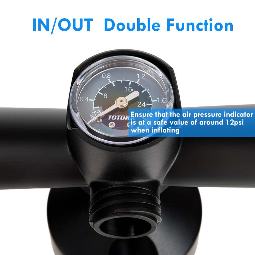 IN/OUT Double Function Ensure that the air pressure indicator is at a safe value of around 12 psi when inflating