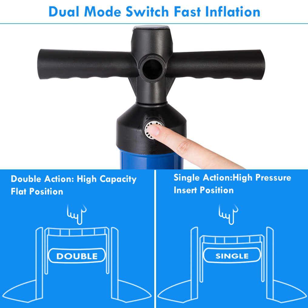 DOUBLE ACTION MODE: Dual Mode Switching Fast Inflation. Double Action mode can be used in the initial stage of inflation to speed up the inflation. When the pressure is high, you can change to using the Single Action mode to easily inflate.