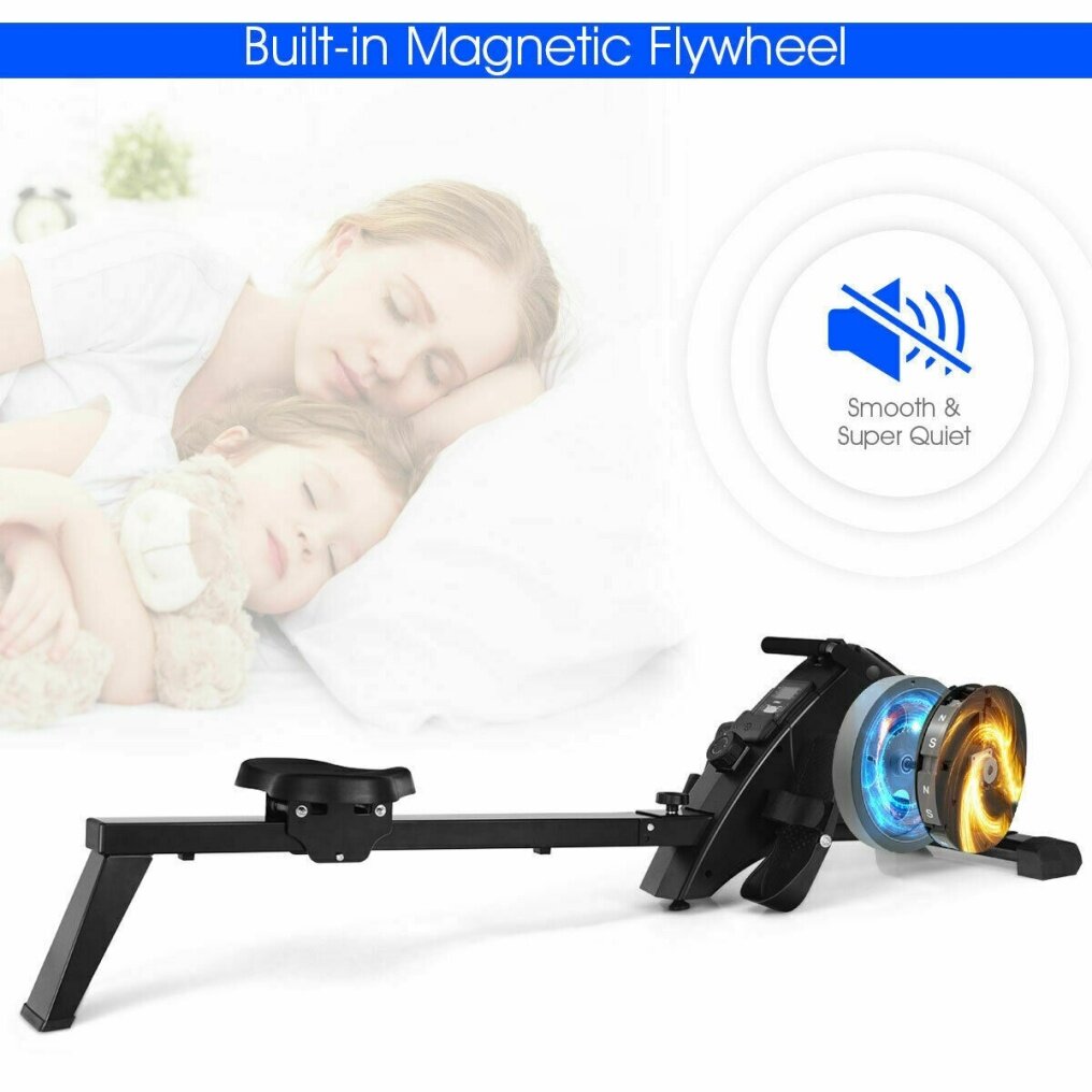 Use this magnetic rowing machine for an effective aerobic workout for a full body that burns fat and builds muscles that help in weight loss. The magnetic rower features a 10-level magnetic tension resistance system that allows a variety of body types and ages to achieve their exercise requirements. It also has an easy-to-read LCD fitness monitor, soft seat, pivoting footplates with straps and comfortable non-slip grip handlebars, and tear-resistant nylon rowing strap. Built-in wheels and a folding frame make storage a breeze. '