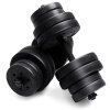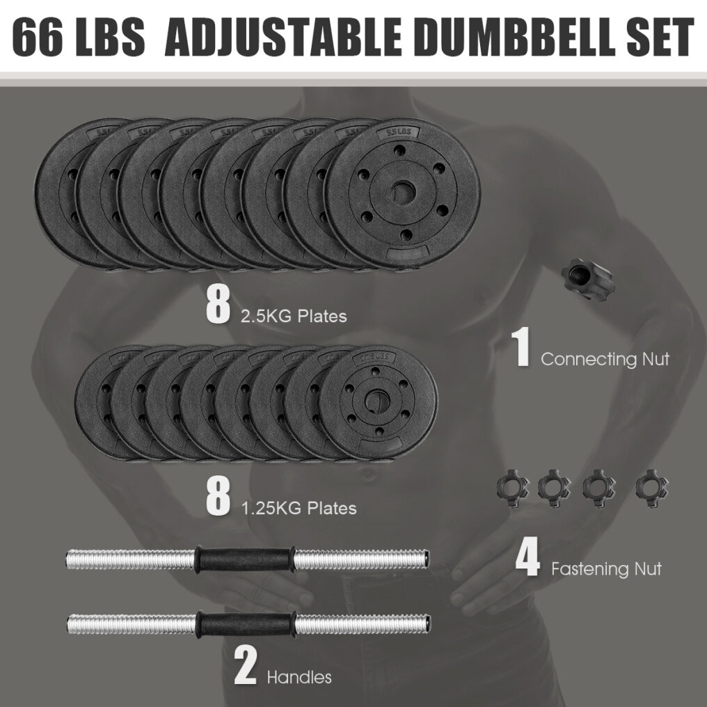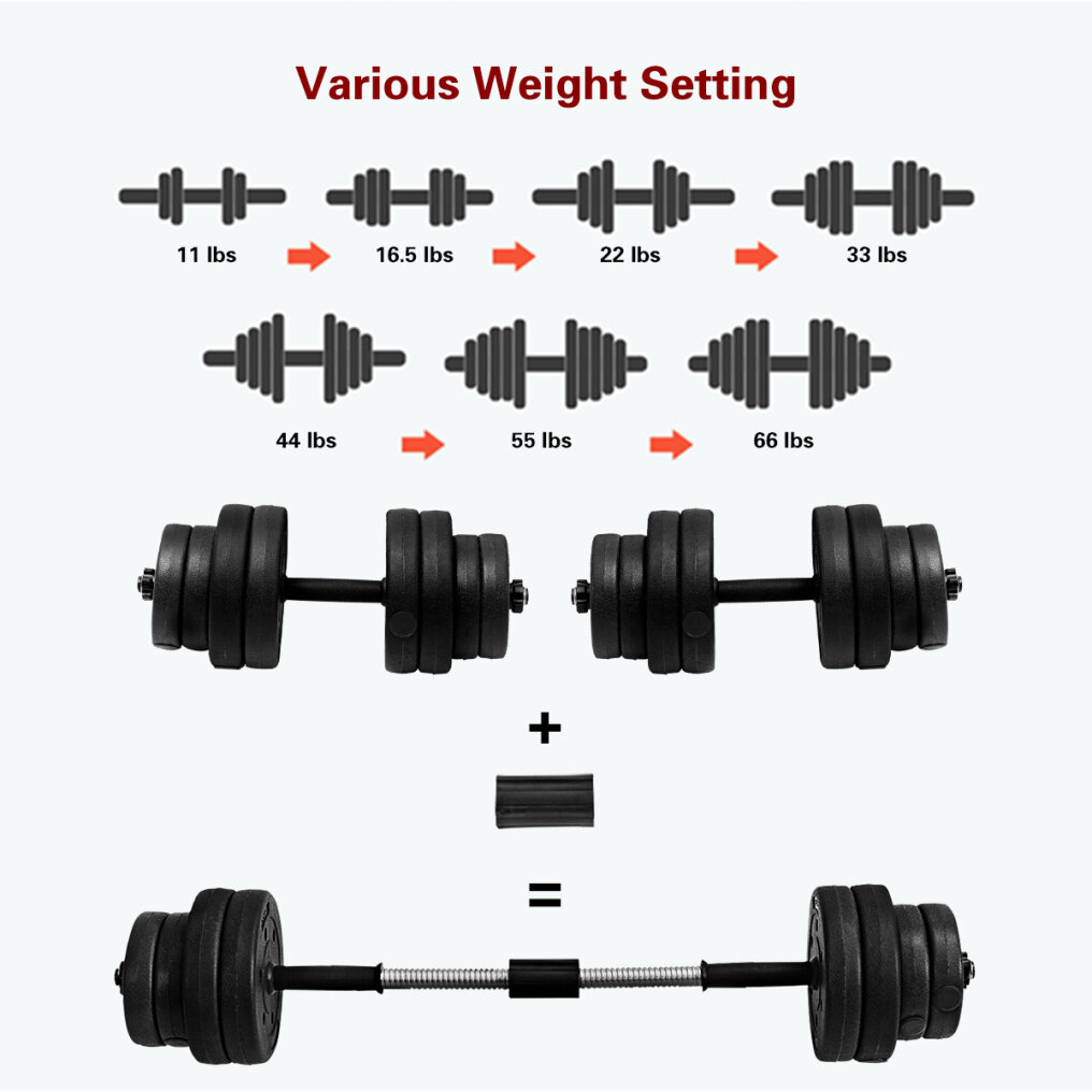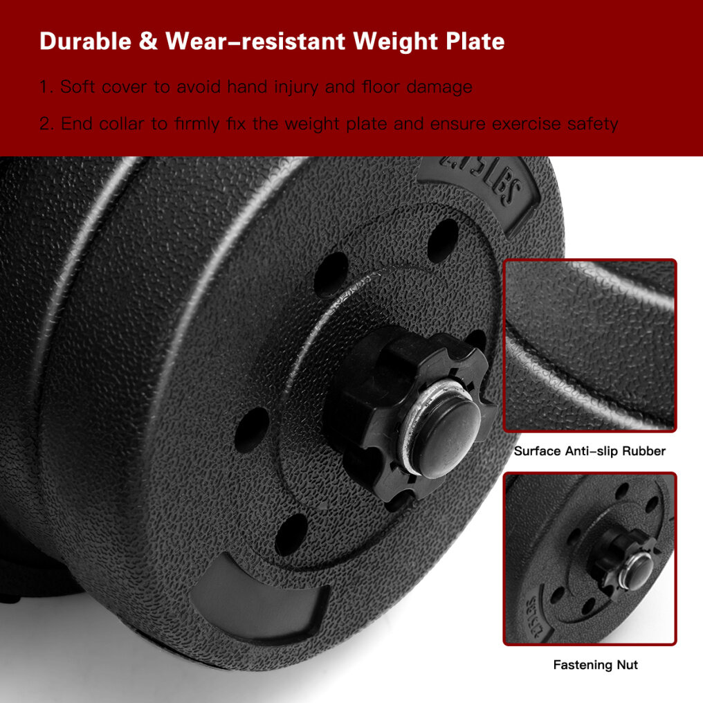 This dumbbell weight set is the perfect addition to any home gym. It contains 8 weight plates with a total weight of up to 30kg, catering to many fitness levels and needs. The weight plate is made of black HDPE polyethylene filled with concrete to enhance sturdiness and durability, plus its surface rubber layer to avoid damage to the ground. The metal thread on the rod prevents accidental sliding of the weight plate while the end collar is designed for securing plates to barbells, which ensures exercise safe and provides simple assembly. Soft-covered grips promote a secure, comfortable hold. Freely connected steel tubes can turn dumbbells into barbells, it not only burns calories but improves muscle strength and muscular endurance.