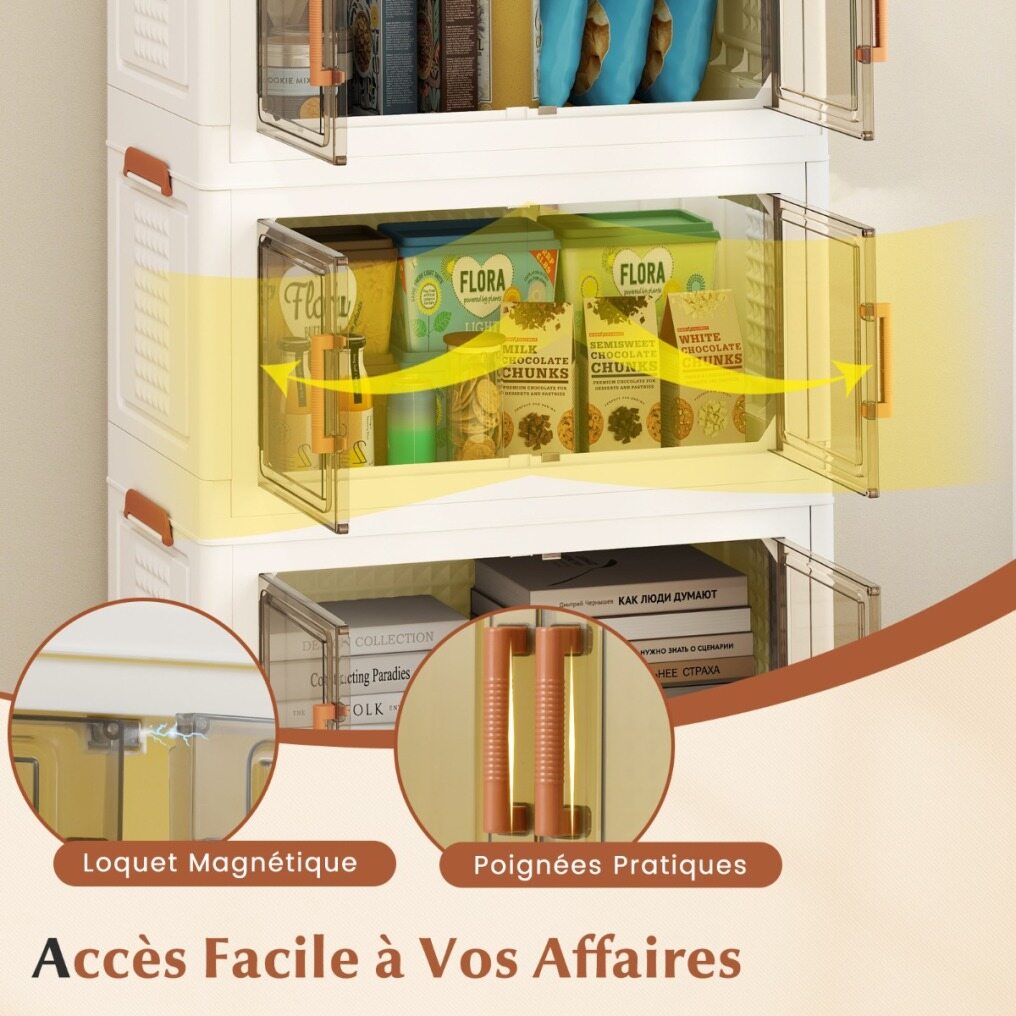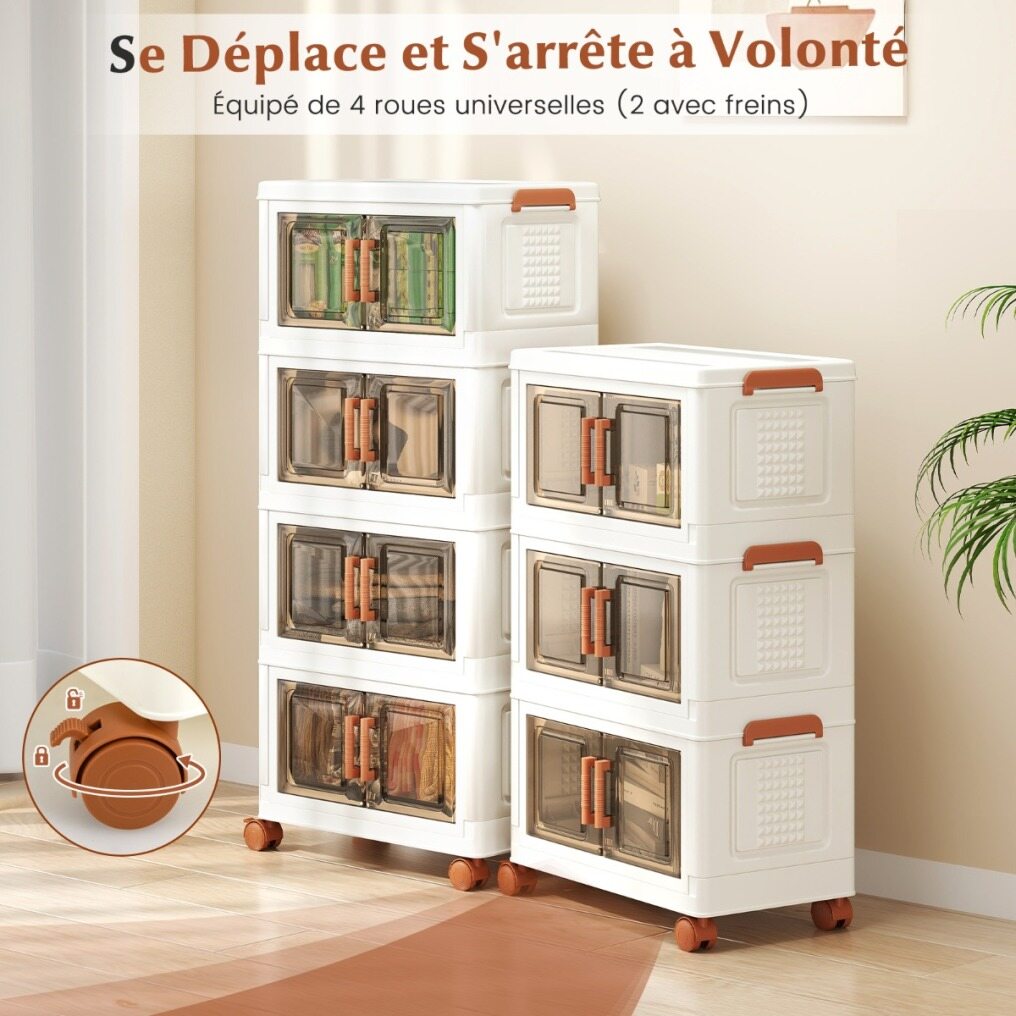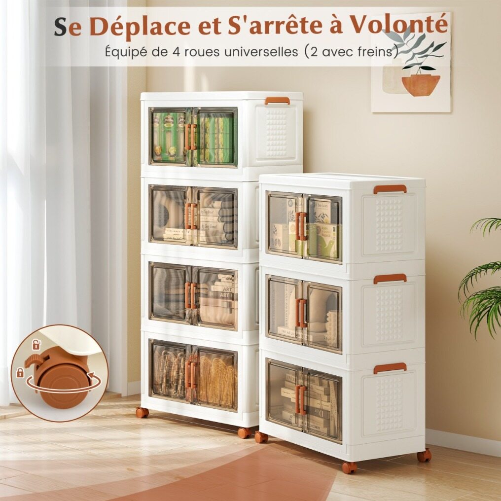 Whether you're organizing seasonal clothing, kitchen supplies, or books, these storage bins offer a convenient solution. You can easily fold them when not in use for compact storage, or stack them to efficiently maximize your space. The front-opening magnetic doors provide easy access to stored items. For added convenience, the storage containers are equipped with easy-to-grip handles. Plus, the 4 universal wheels (2 with brakes) allow you to move them effortlessly around your home. These versatile storage bins can be used as a clothing organizer, shoe rack, snack cabinet, or even a tool cabinet.