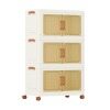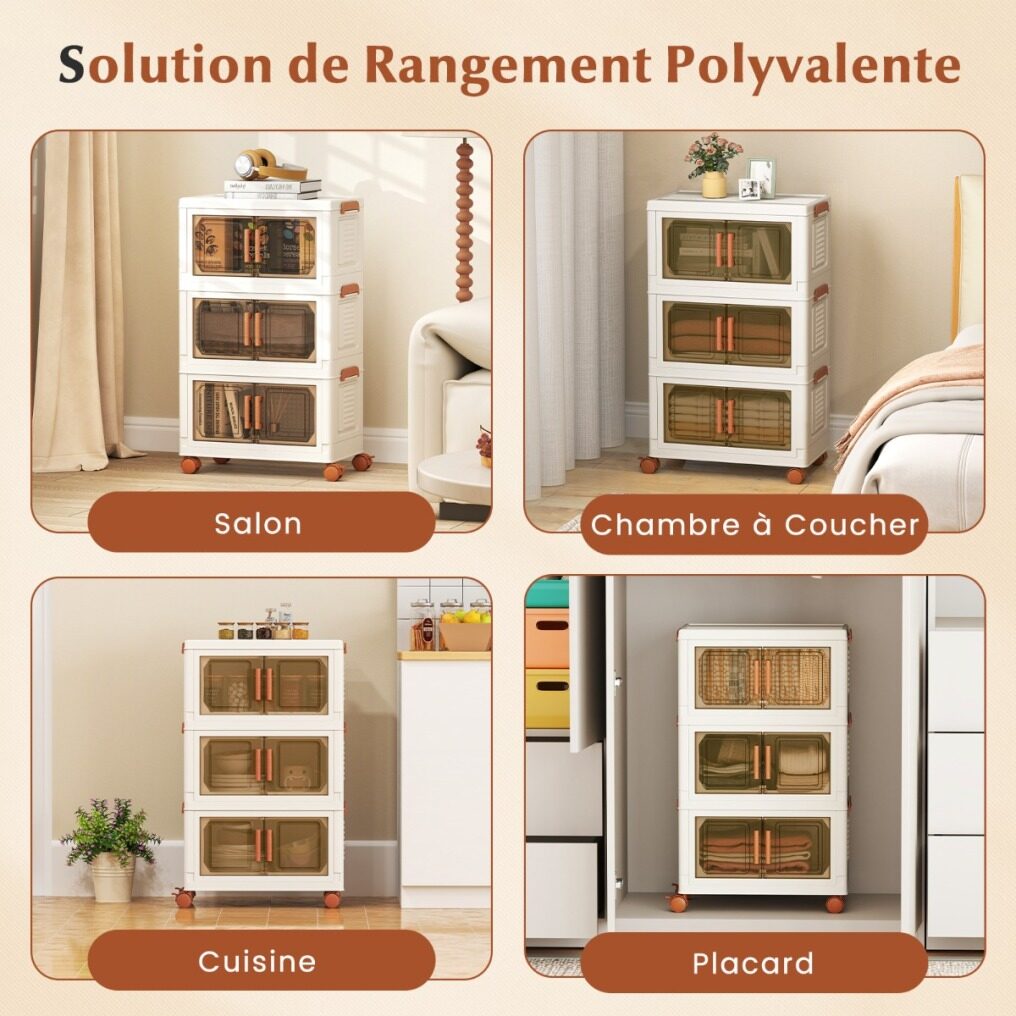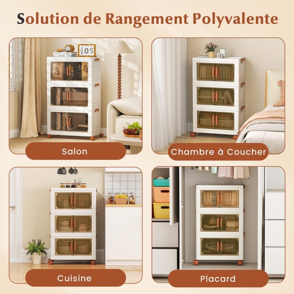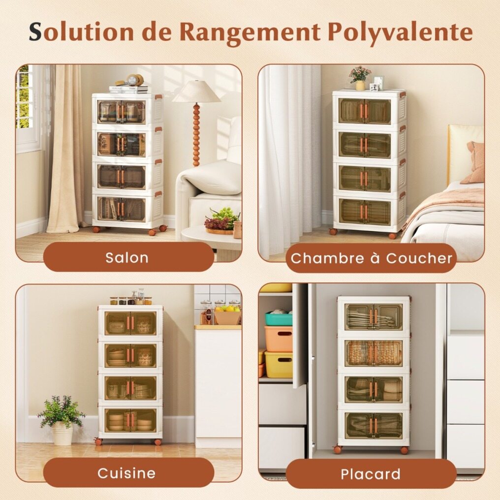 Whether you're organizing seasonal clothing, kitchen supplies, or books, these storage bins offer a convenient solution. You can easily fold them when not in use for compact storage, or stack them to efficiently maximize your space. The front-opening magnetic doors provide easy access to stored items. For added convenience, the storage containers are equipped with easy-to-grip handles. Plus, the 4 universal wheels (2 with brakes) allow you to move them effortlessly around your home. These versatile storage bins can be used as a clothing organizer, shoe rack, snack cabinet, or even a tool cabinet.