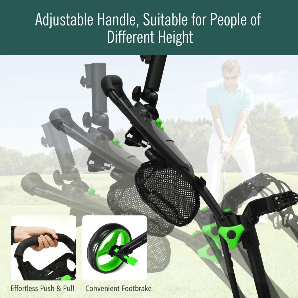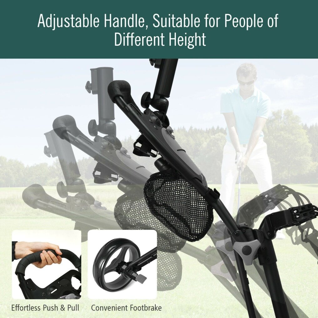 The golf carts are built with a super strong, lightweight, and sturdy aluminum frame that makes the golf pull cart easily maneuverable. Wide body design and big 10.5inch rear wheels and 9.5inch front wheels adds extra balance to the cart and effortless pushing. Simply tap the brake with your foot to engage the brake, then tap with your foot again to release the brake. No need to worry about that the cart will lose control. The handle and umbrella holder of this golf push cart is both adjustable to satisfy different needs of users. The foldable golf cart also has the net storage bag to place golf equipment. It is the best helper for golf game.