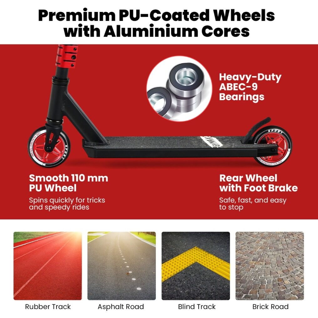 High-Rebound PU Wheel and ABEC-9 Bearings: the pro scooter features high-duty 110 mm PU wheels with aluminum alloy cores that are durable and high-rebound, and high-precision ABEC-9 bearings, provide smooth ride and fast spin performance while also ensuring significantly improved balance and stability. And there exists a foot brake on the rear wheel allowing for easy and immediate stops in emergencies