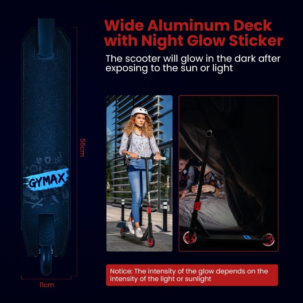 Excellent Luminous Aluminum Deck:  The kick scooter is designed with a wide aluminum deck that measures 51 x 11 cm (L x W), which can withstand amazing tricks and any landings. More importantly, there exist luminous anti-skid stickers that can glow in the dark after exposure to the sun or light. (Notice: The intensity of the glow depends on the intensity of the light or sunlight.)