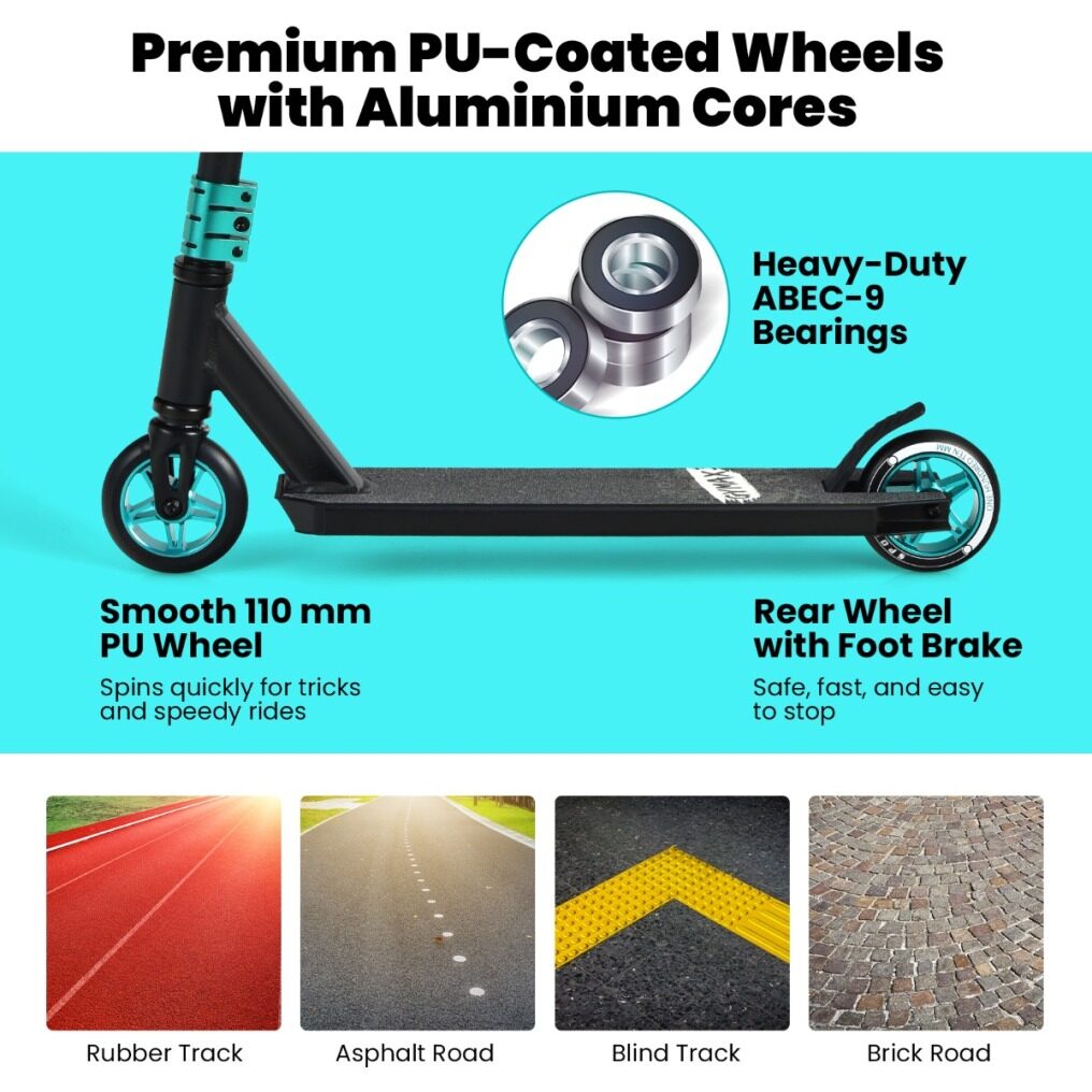High-Rebound PU Wheel and ABEC-9 Bearings: the pro scooter features high-duty 110 mm PU wheels with aluminum alloy cores that are durable and high-rebound, and high-precision ABEC-9 bearings, provide smooth ride and fast spin performance while also ensuring significantly improved balance and stability. And there exists a foot brake on the rear wheel allowing for easy and immediate stops in emergencies