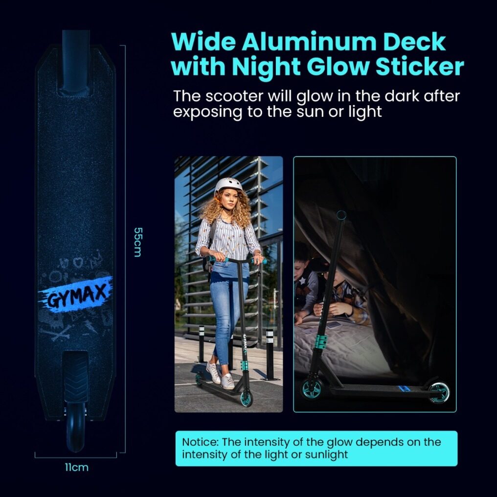 Excellent Luminous Aluminum Deck: The kick scooter is designed with a wide aluminum deck that measures 51 x 11 cm (L x W), which can withstand amazing tricks and any landings. More importantly, there exist luminous anti-skid stickers that can glow in the dark after exposure to the sun or light. (Notice: The intensity of the glow depends on the intensity of the light or sunlight.)