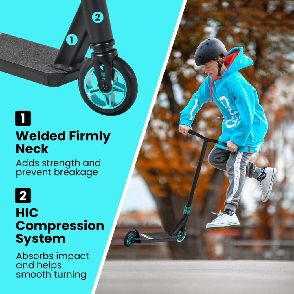 HIC Compression System & Easy Assembly: The stunt scooter is designed with a reliable HIC compression system to absorb impacts from your jumps and tricks, while the soft and comfortable TPE grips do the same for your hands. In addition, it is easy and quick to set up by tightening the triple bolt clamp.