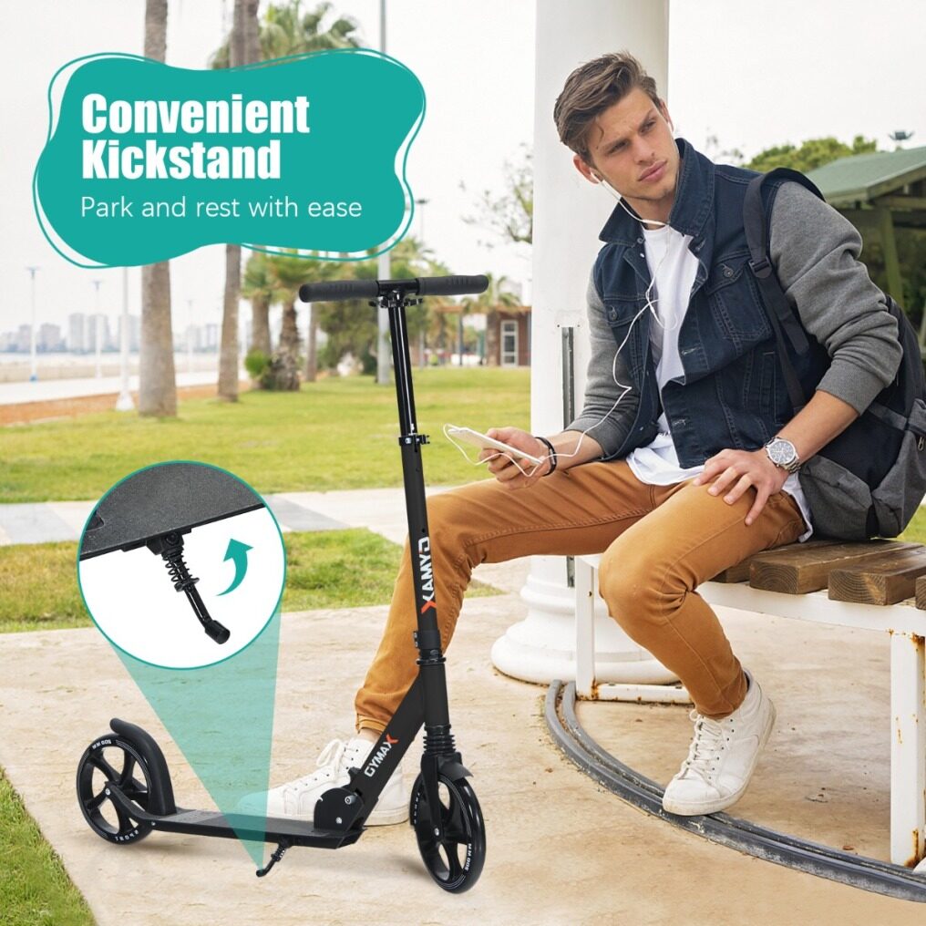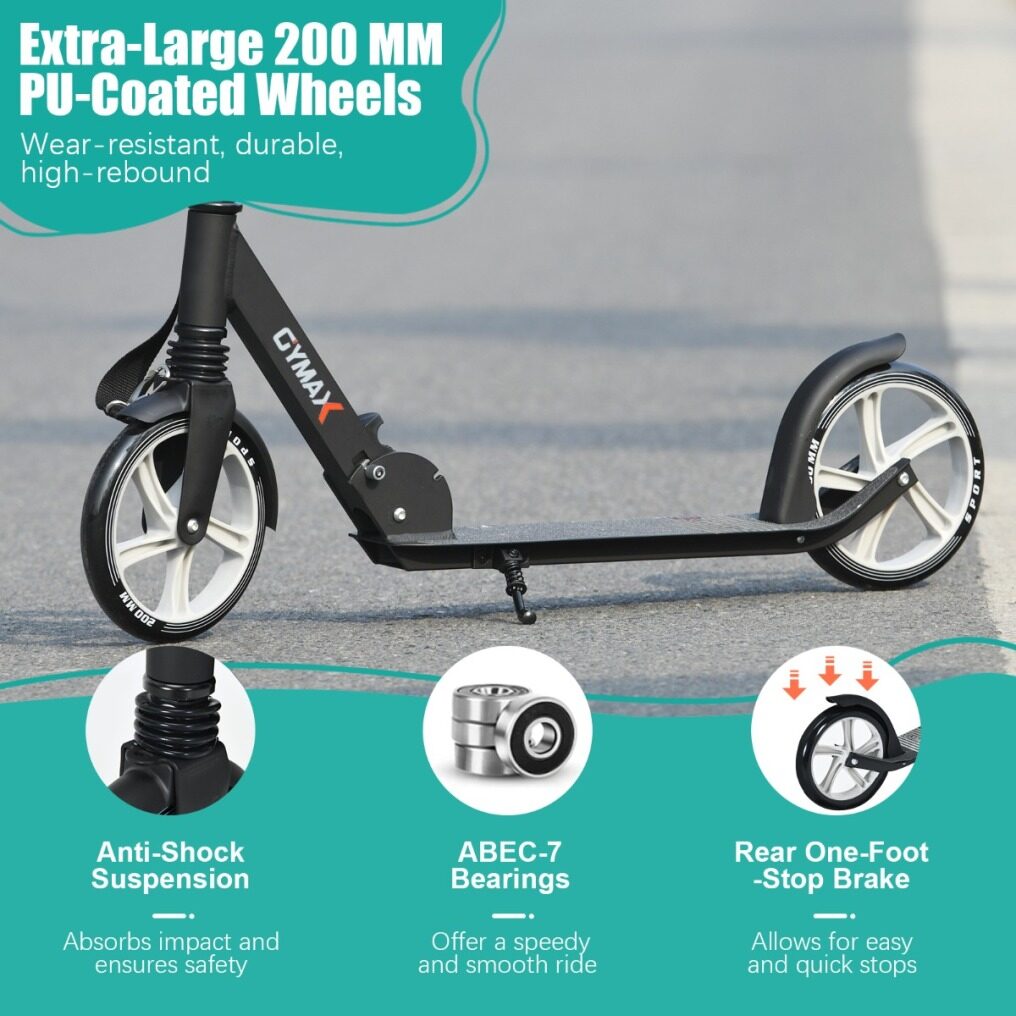 Enjoy a Comfortable and Smooth Ride with this Kick Scooter! The kick scooter can meet your multiple needs, whether cruising with friends, commuting to work, or riding on campus, it can be your best choice. With ultra-large 200 mm PU wheels and high-precision ABEC-7 bearings, it would give you the maximum amount of speed with a good smooth. Besides, the height of the handlebar can be adjusted from 88 cm to 98 cm according to the rider's height and comfort. And the non-slip TPE handle grips provide extra comfort. Moreover, the scooter can also be folded within seconds, and the carrying strap helps you carry it out effortlessly. Thanks to the anti-shock suspension that can effectively absorb impacts, the ride would be more smooth and safer. And the textured non-slip deck is widened for a stable footing and a secure glide. Whether as a birthday gift, Thanksgiving gift, or a Christmas gift, this scooter will be the perfect gift that your kid really wants.