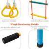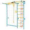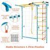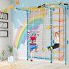 This 7-in-1 indoor playground is designed with wall ladder, pull-up bar, rope ladder, rope, rope wall, monkey bars and gymnastic rings, providing numerous activities and endless fun to children. Made of powder coated carbon steel pipes, the home playground is not only stable and durable, but also rust resistance for long time use. The bottom is thoughtfully designed with foot pads to protect your floor from scratching. And padded handles of the pull-up bar are comfortable and safe to grip. The frame is required to be fixed to a wall and the expansion screws that you need comes with the package. Other parts of the equipment are easy to assemble with the instructions.