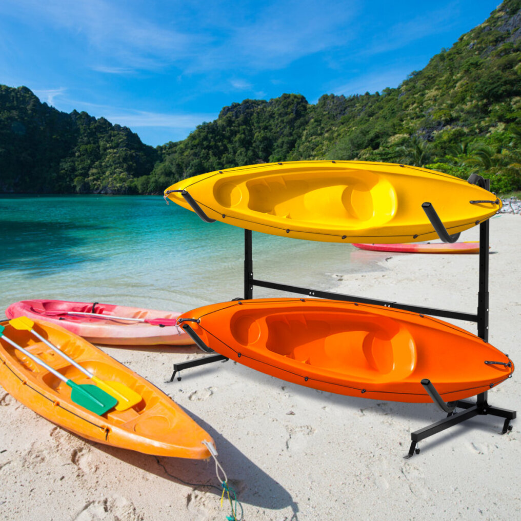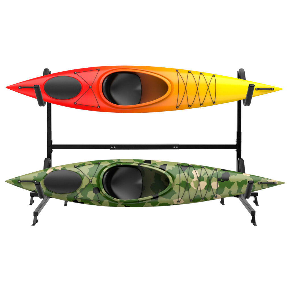 This height adjustable freestanding kayak rack can easily hold 2 kayak in different sizes.