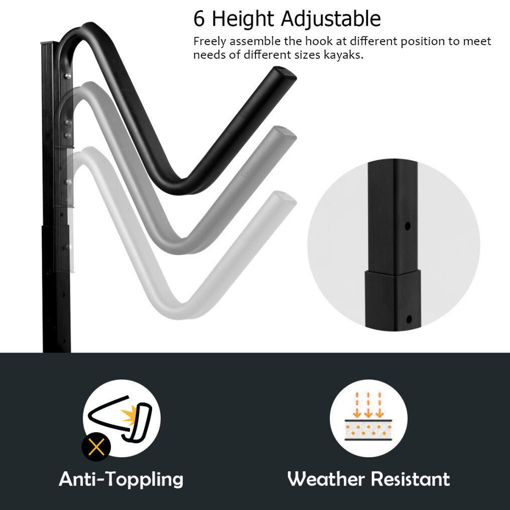 - 2 removable hooks holding up to 2 kayaks, 6 adjustable heights to meet needs of different sizes kayaks