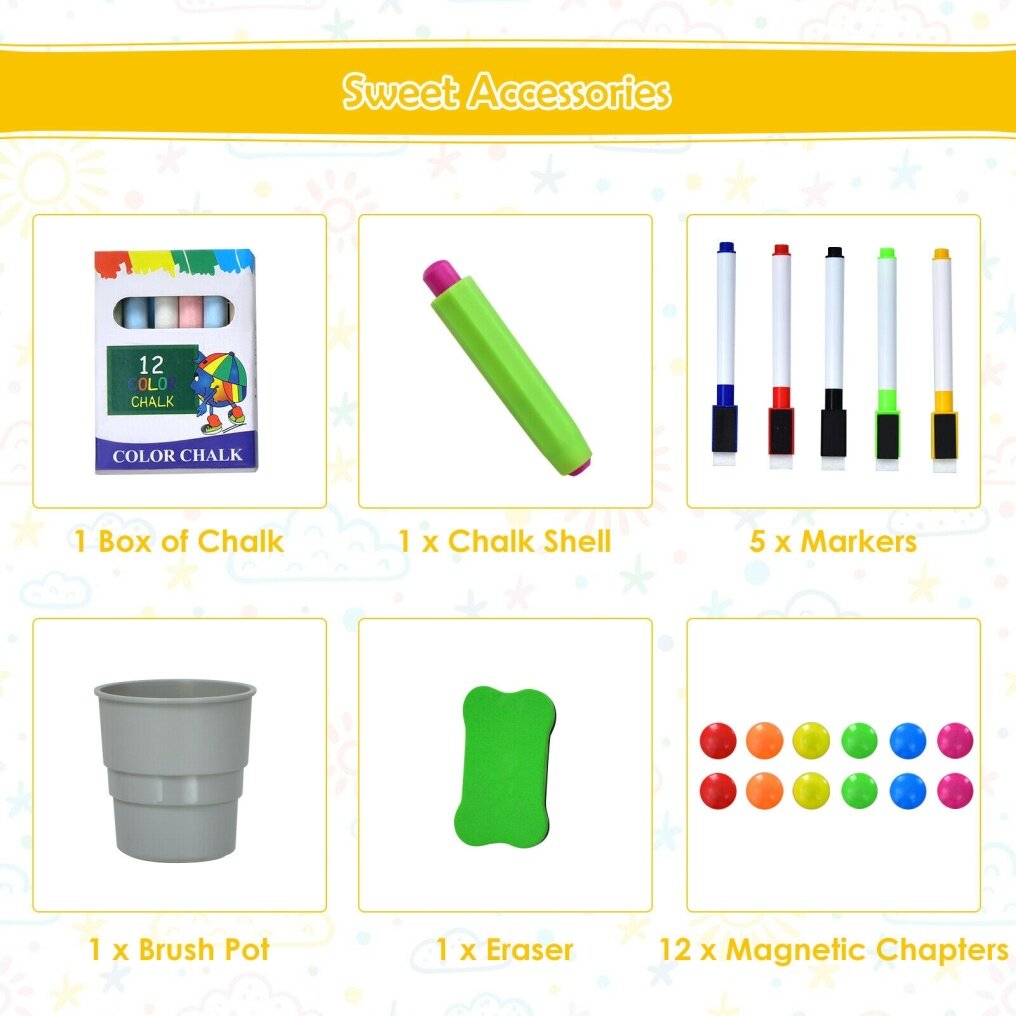- Comes with eraser, chalks, magnetic chapters, markers, chalk cap and brush pot