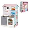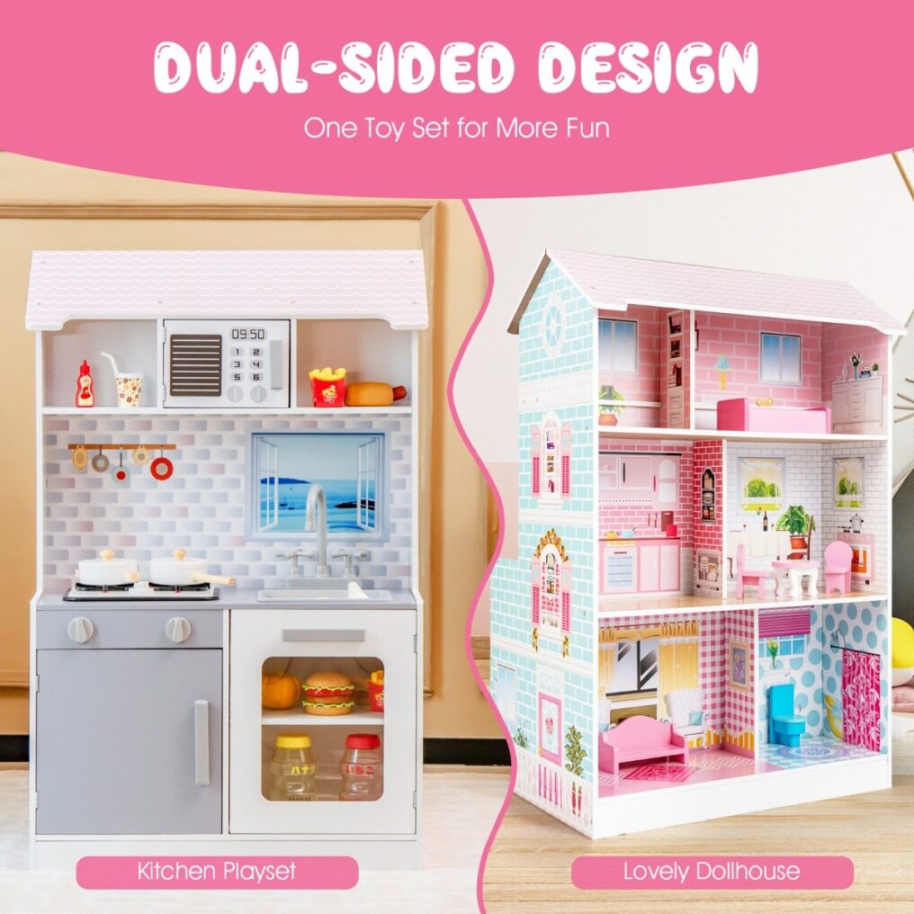 High Stability & Durability: This 2 in 1 doll house and play kitchen is constructed from high-quality MDF boards, which make the play set stable and durable. What's more, this wooden toy set is designed with smooth edges to ensure children's safety.