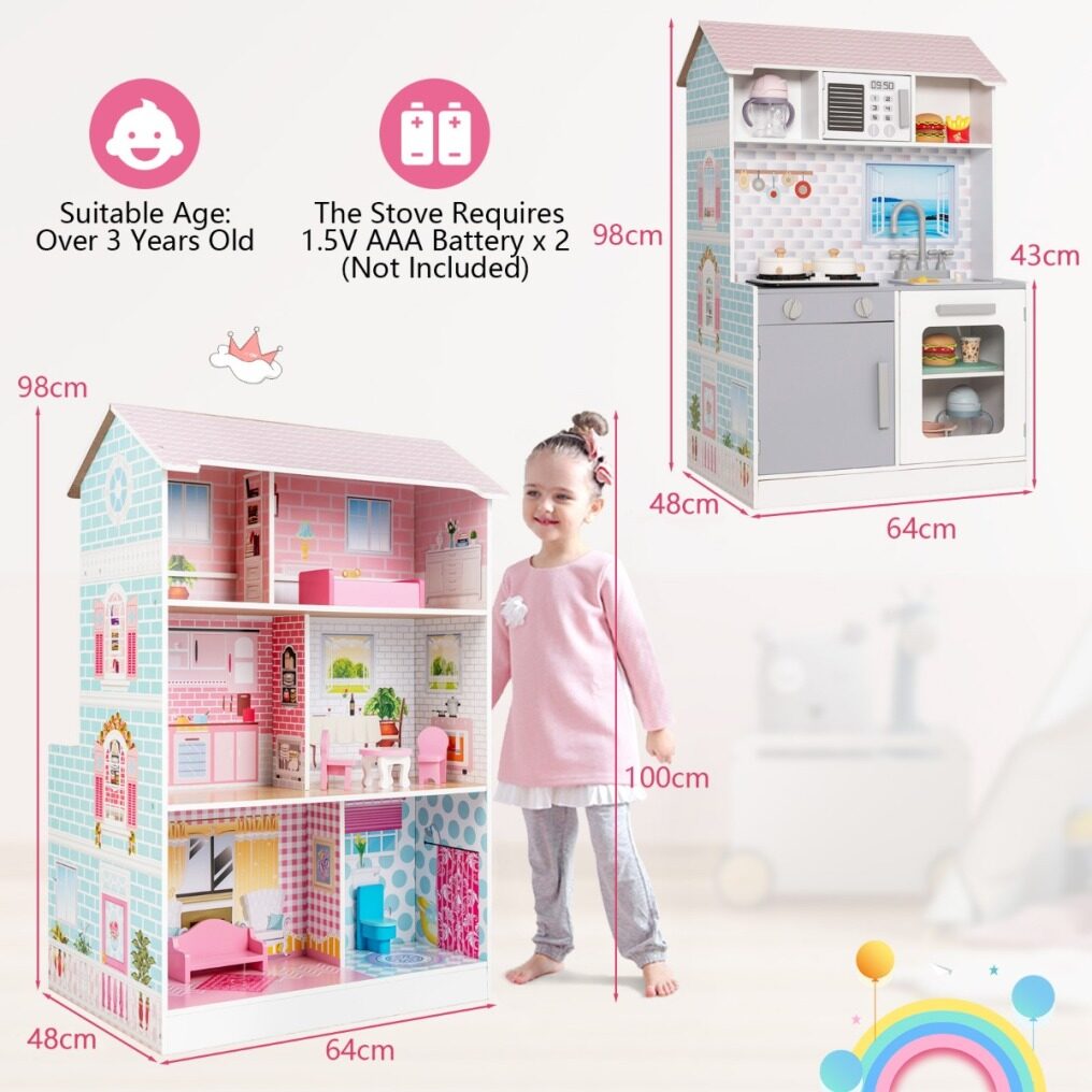 Ideal Gift for Children: Suitable for kids 3+, this play kitchen and large dollhouse set is a great gift for birthdays, Christmas or any other special occasion. Kids can release their creativity, develop communication skills and improve their hands-on ability while playing.