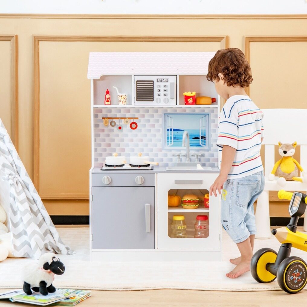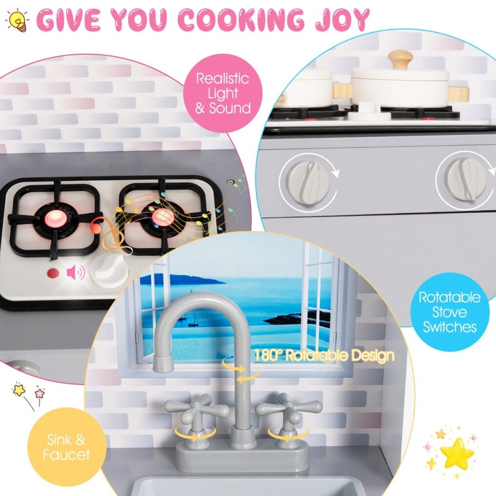 Authentic Cooking Play: Having the microwave, stove, sink and tap with switches, this toy kitchen lets children pretend to cook like the real. Additionally, the rotatable stove switches can make click sounds, and the stove produces realistic lights and sounds.