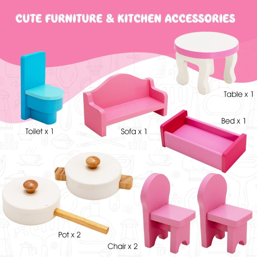 2 in 1 Design: This wooden play set combines a kitchen and dollhouse, so children can pretend to cook or enjoy role-play games with their friends. Also, the cooking accessories and furniture included allow kids to have more play ways and more joy.