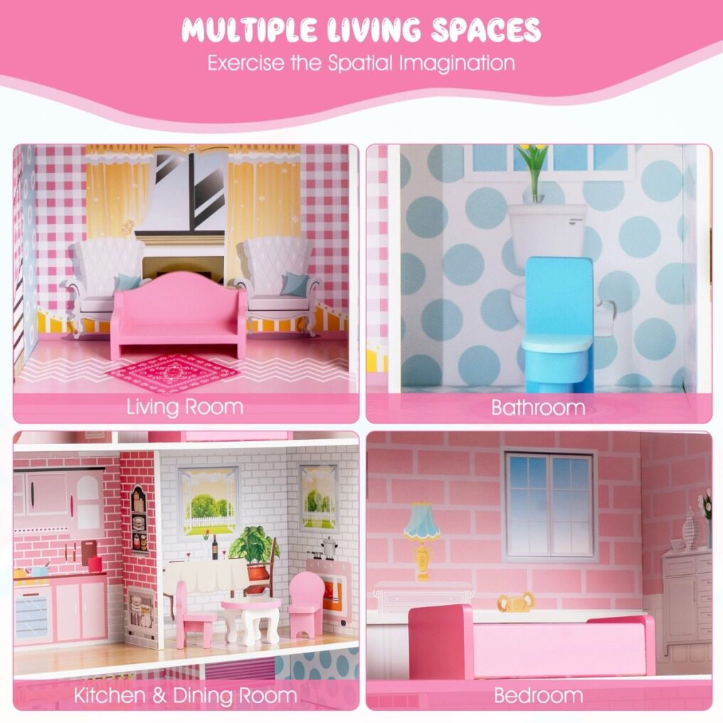 3 Storey Dollhouse: Featuring exquisite sticker covers, the dollhouse side is divided into 3 layers and has the living room, bathroom, kitchen, dining room and bedroom. Children can decorate the dollhouse with the included furniture.