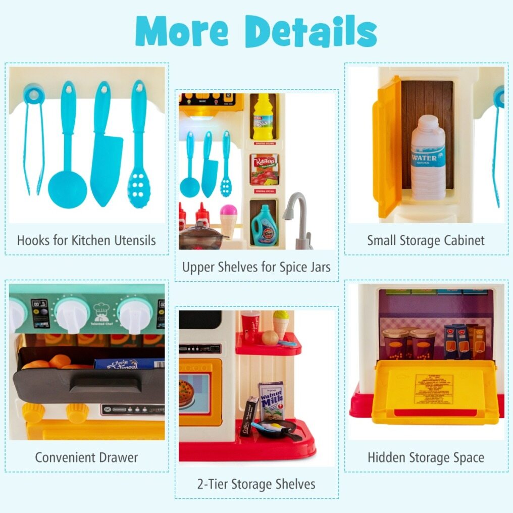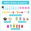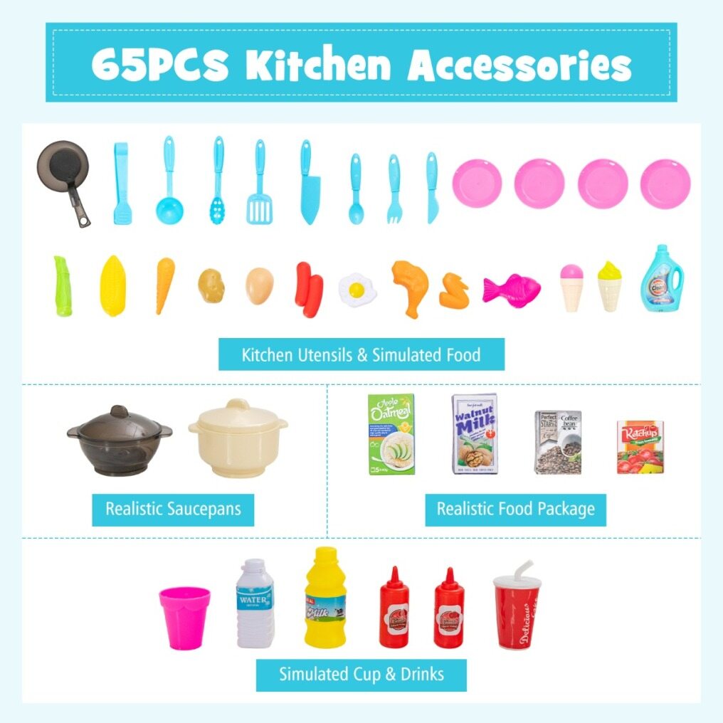 Rich Accessories & Storage Space: This kid's play kitchen set comes with 65 Pieces of accessories, which are all cute and exquisite. And for storing these accessories, the various spaces of this kitchen toy play their roles. Children can learn how to organize and store their items.
