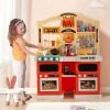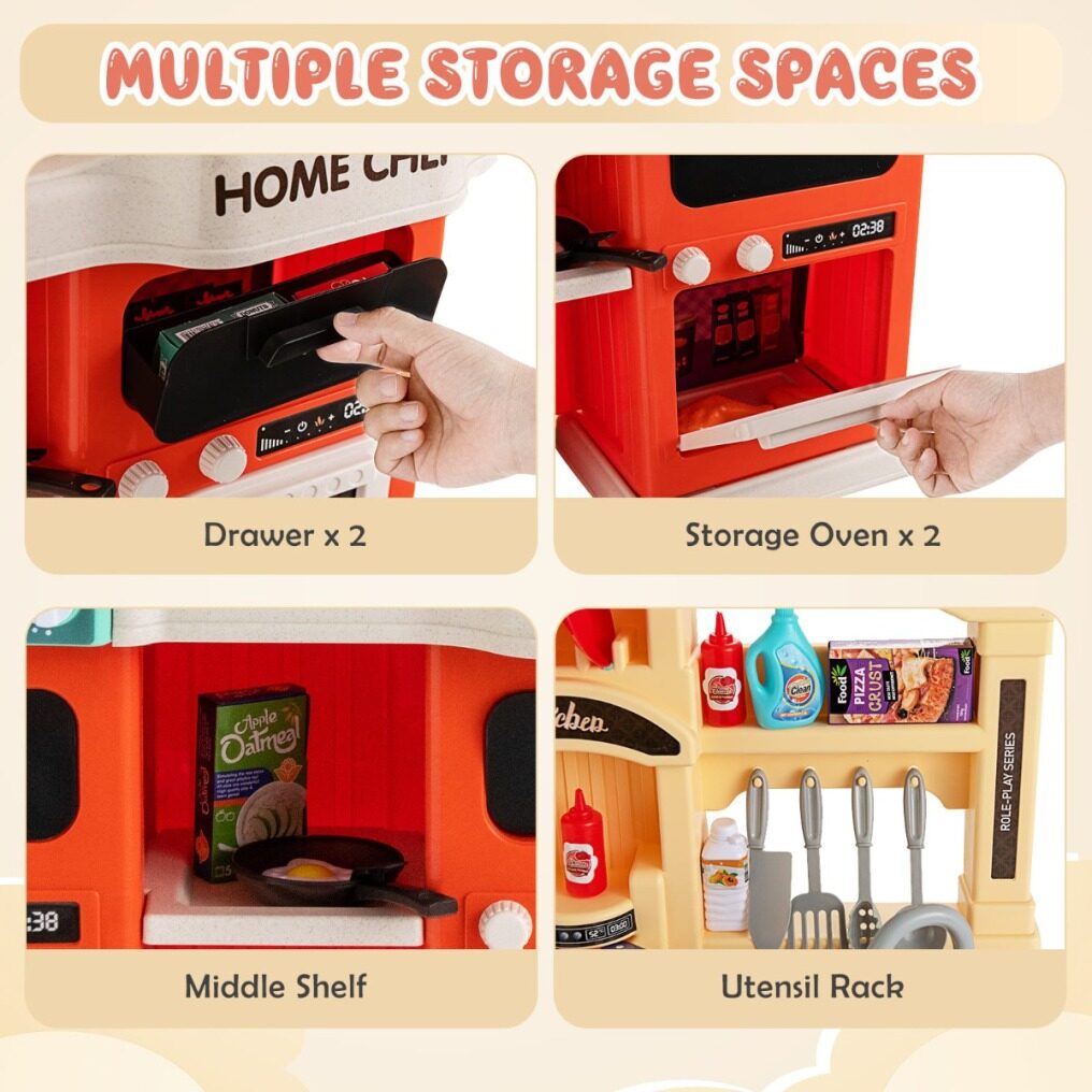 ● All-In-One Kitchen Play Set: The kitchen toy features two ovens, an electronic stove top burner, a range hood and a sink with running water. Cute appearance and bright color make it a perfect gift for toddlers. You can play kitchen games with your children, which can not only increase intimacy, but also develop your kids' cooking skills and imagination.