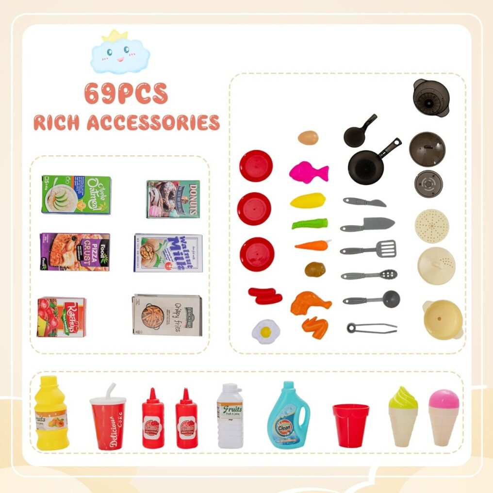 ● Realistic Game for Joy: Rotate the burner button, the stove comes with two cooking sounds, then the water in the pot will appear boiling and pretend steam will come out. In addition, the hood has two lighting effect. By pressing the button, the hood can play music and simulate the sound of the hood. Those details add realism and joy to the kitchen game.