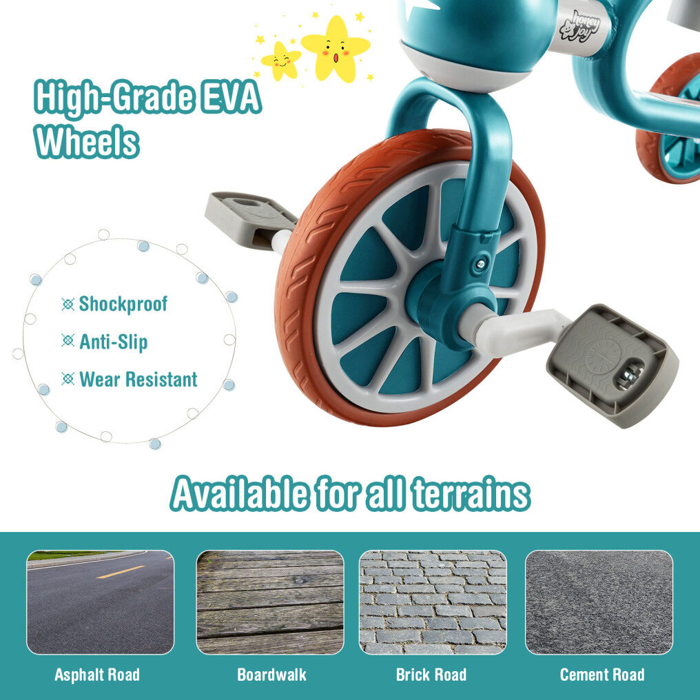 Premium EVA Wheels: Equipped with 4 high-quality EVA wheels, the kids tricycle provides excellent shock absorption and anti-skid performance, providing your little one with a smooth riding experience. Besides, it can be used on various surfaces, such as boardwalks, cement roads, asphalt roads, cobblestone roads, etc.