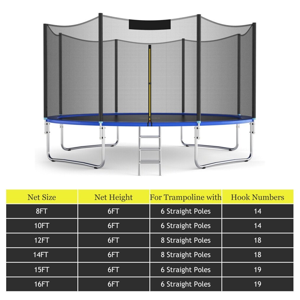 ● High Quality PE Material: This tightly Woven protective net is suitable for 8ft round trampoline frame with 6 straight poles to use. Package included 8ft trampoline safety net and 14 hooks. And the trampoline enclosure net is made of tear-resistant PE material, which is durable, and closely connected to protect kids while jumping.