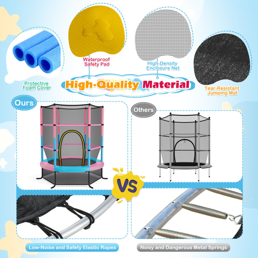 ● Enclosure Safety Net: The enclosure safety net is installed inside with jumping mat to better protect kids from getting their hands or feet stuck. Its see-through design also allows you to keep an eye on them conveniently. The entrance provides easy access to trampoline and double-side zippers offer extra protection.