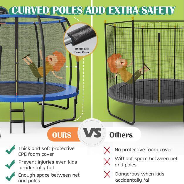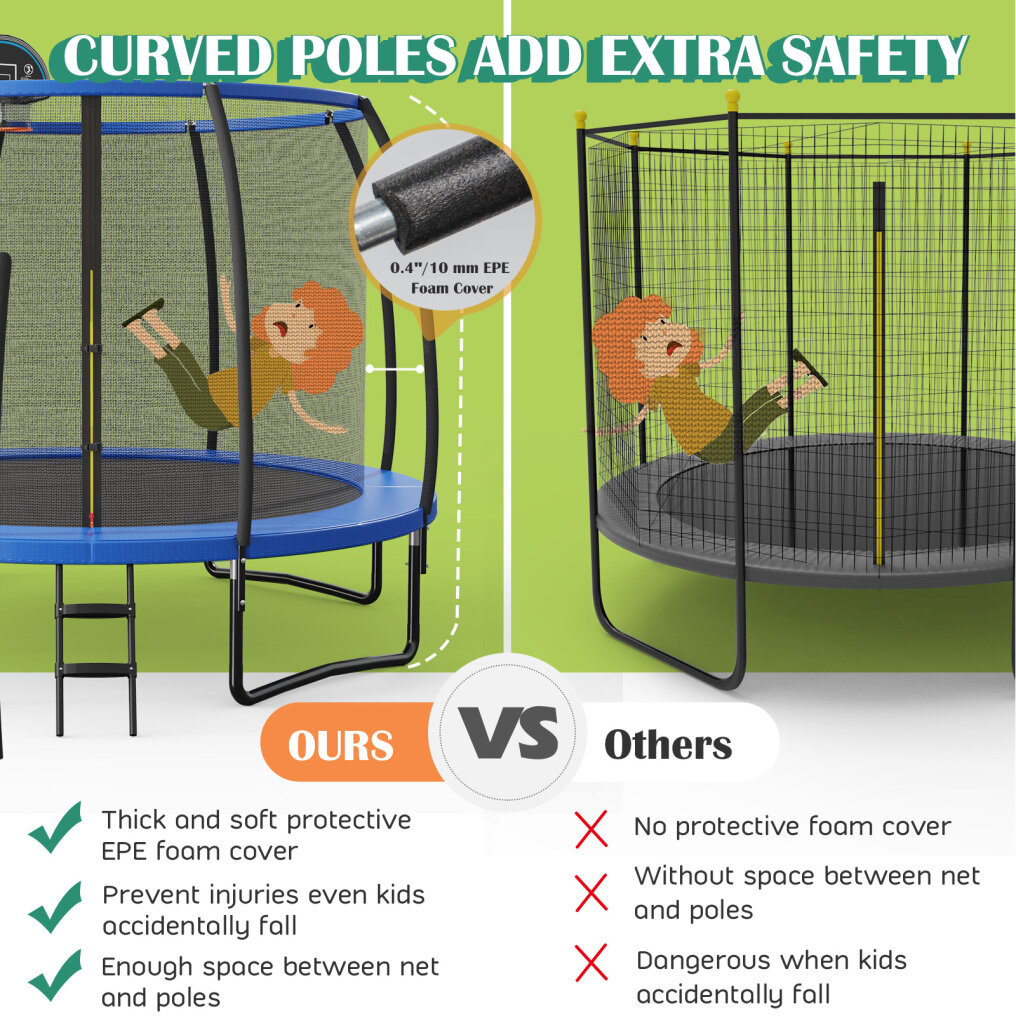 ● Safety Always Comes First: This trampoline meets the ASTM standard to ensure high quality and reliable stability. Comparing to those trampoline with straight poles, the trampoline specially designed with curved poles can prevent injuries when kids fall down. The safety enclosure with safety buckles and double-headed zipper will fully protect kids' safety during jumping.