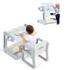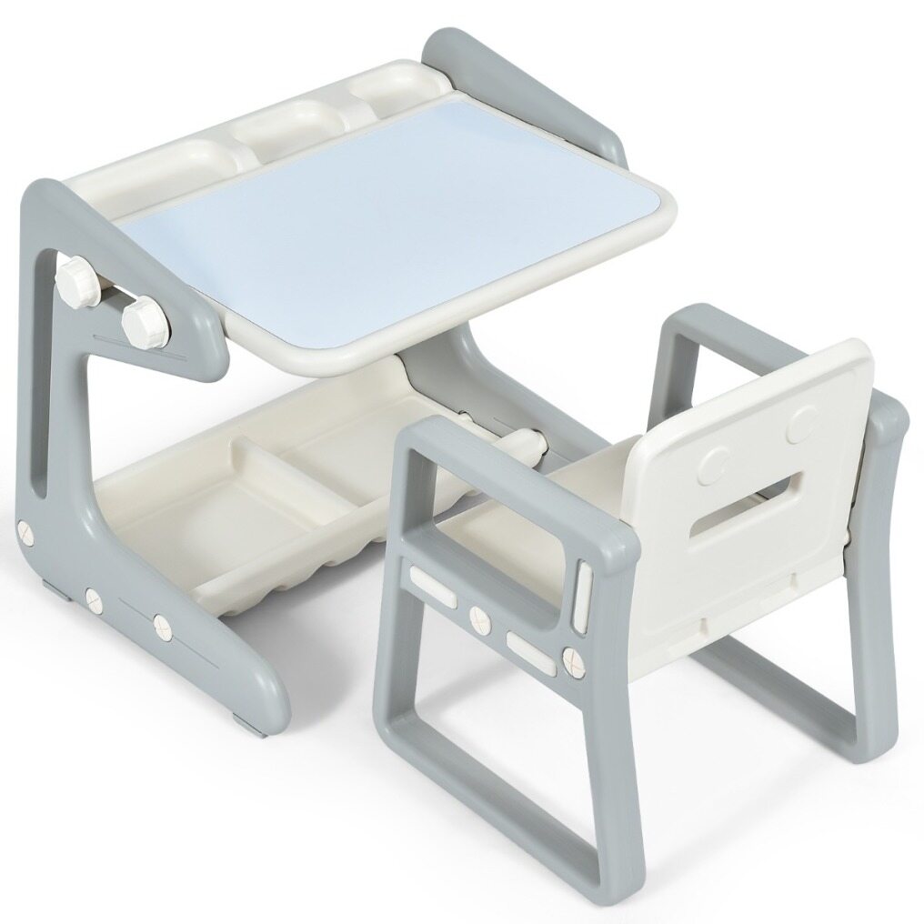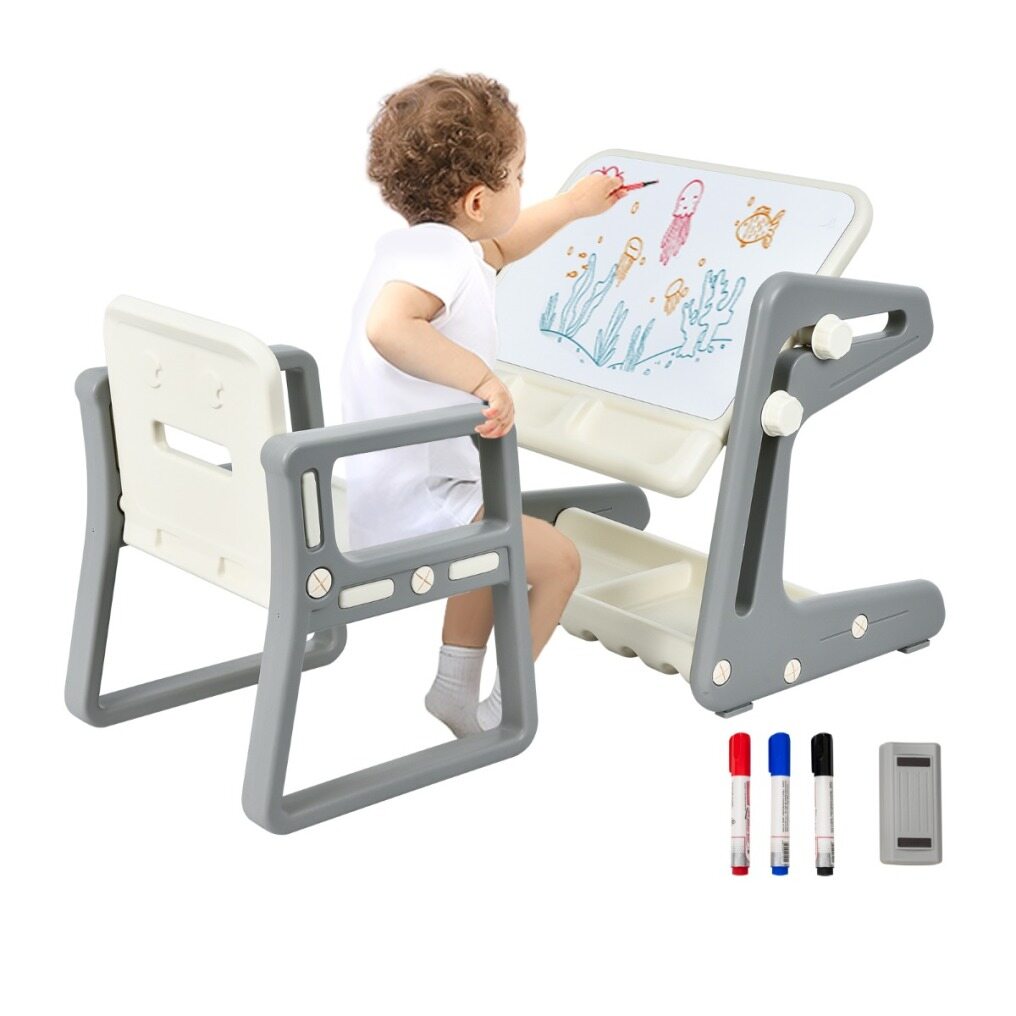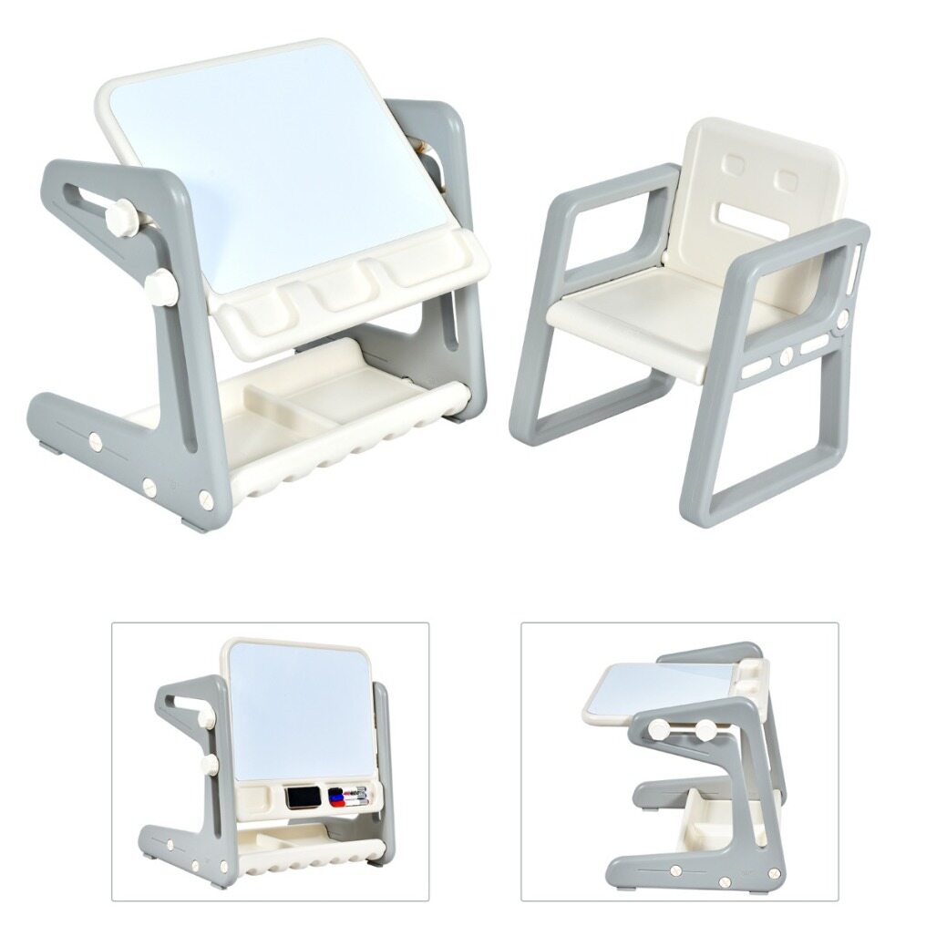 This 2-in-1 kid painting board with the chair set can not only be used as a table, but you can also adjust the angle to make it a drawing board. Both the tabletop and the bottom of the table feature slots, providing enough space for your child to store whiteboard pen, eraser, toys and other sundries. The odorless HDPE material and rounded corners are designed to protect your child's safety. The comfortable backrest provides support for the child's body. Foot pads are dedicated to effectively preventing the floor from being scratched. The table can be installed in a few simple steps, saving you time and energy.
