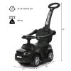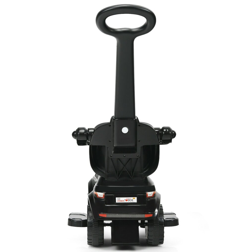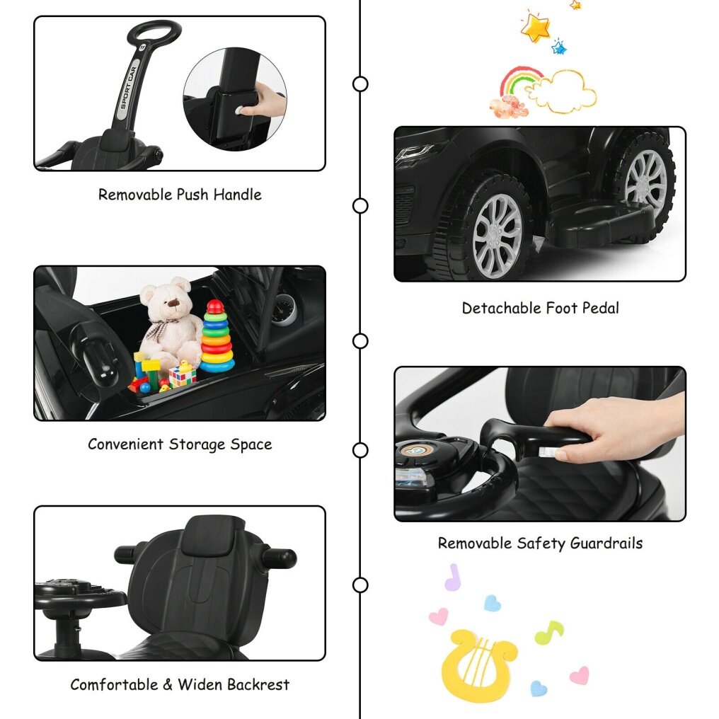This car toy combines the functions of stroller, walking car and ride-on car for easy pushing, pulling and sliding.Your little angel can slide the car by himself/ herself, or you can control the car with a removable handle rod. Wear-resistant wheels, safety guardrails and anti-fall board are protective enough to enhance kids' safety during riding. If kids want to carry some small toys, snacks or other items, the hidden storage room under the seat will satisfy their requirements perfectly. Ergonomic seat, built-in music, horn sound and steering wheel will give them wonderful and exciting driving experience. It is an ideal present for your child aged 12-36 months old.