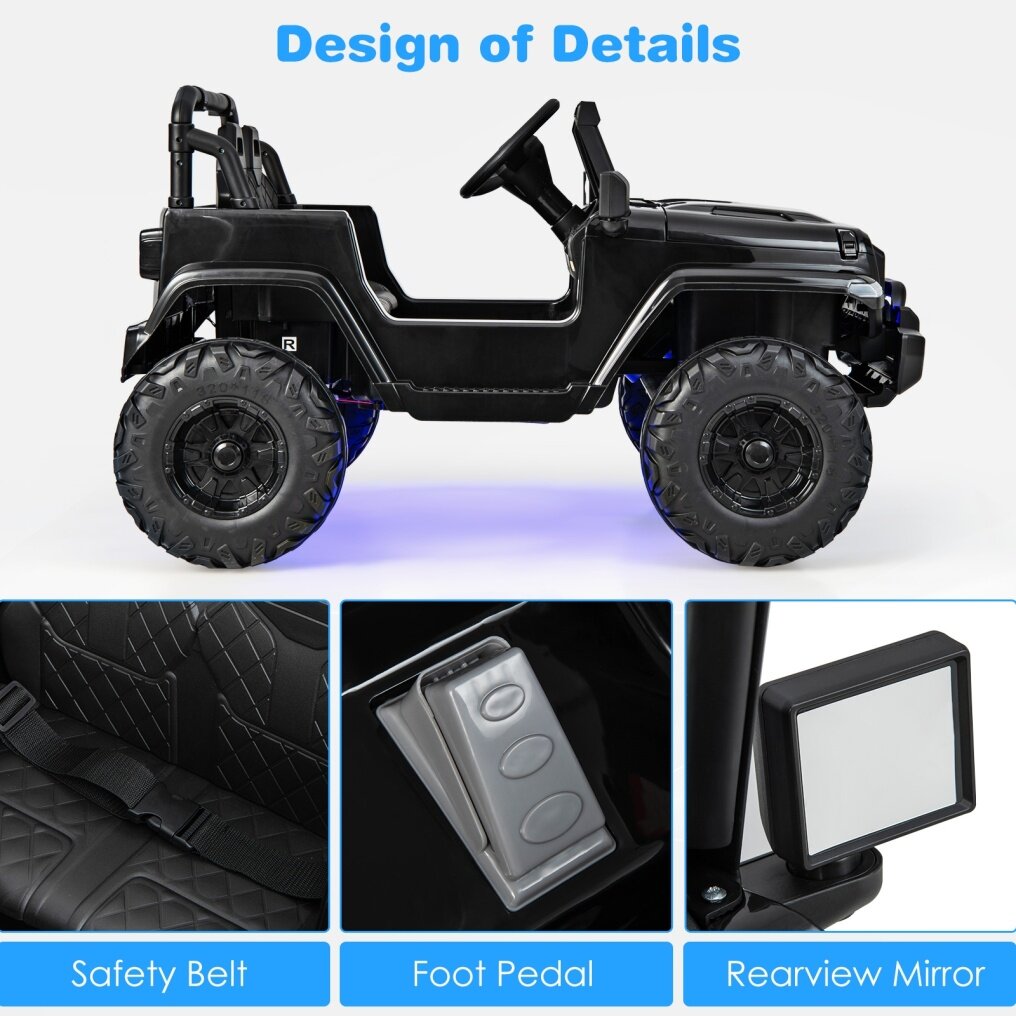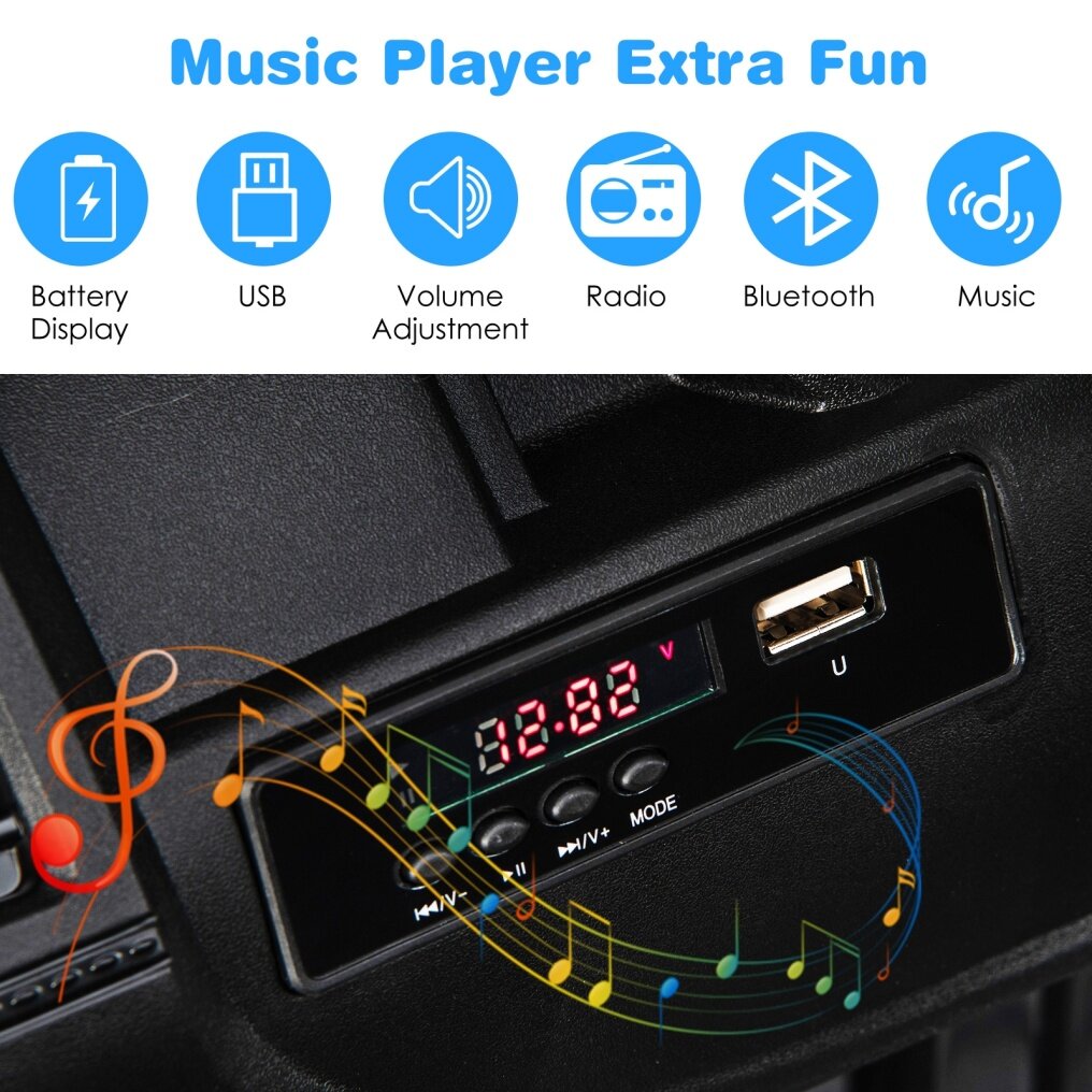 ● Unlimited Music Choices: This kids' ride-on car includes a multi-functional music player. This not only provides early education for kids but also makes driving enjoyable. In addition to built-in music, you can also use USB and FM radio. What's more, the electric car for kids also supports audio, you can play a child's favorite music. With various music and cool LED light effects, driving would be really fun.